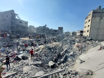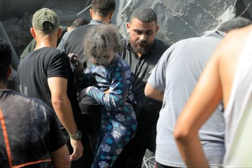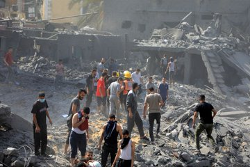 Photos tweeted by @ShehabAgency showed rescuers searching through a massive expanse of rubble, with one image showing a man carrying a child in pajamas who was covered in dust. According to the post, “Civil Defense and Medical Services crews retrieved a number of martyrs and transport the injured from the “al-Faluja” Martyrs’ Roundabout area in the Jabalia camp in the northern Gaza Strip, after it was targeted by [Israeli military] aircraft.” Alhaya.ps announced “massive destruction and large numbers of martyrs and wounded,” sharing multiple photos of the obliterated residential area, including one in which rescuers in orange vests attempted to excavate the body of a man from beneath a pile of shattered concrete. Similar images by Fi Alzaqzaqi News depicted the scale of destruction, with one photo showing a man sobbing and raising his hands in prayer atop a pile of rubble and another photo showing a group of rescuers carrying a man – whose condition is unclear – on a stretcher.