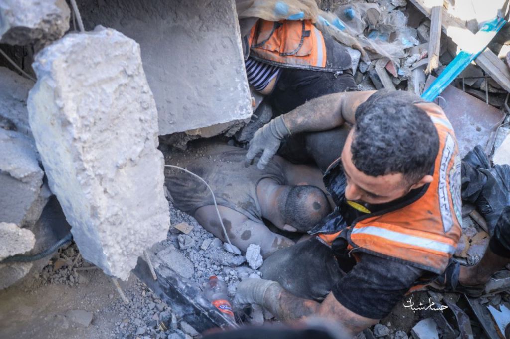 Mohammed Adel shared a video (seemingly produced by the Palestinian Ministry of Interior) with the caption: “a massacre against my family, the Abu Eida family. There are dozens of martyrs in Jabalia camp.” The video showed the destruction of the residential area, rescuers frantically arriving at the site and carrying bodies away from the rubble, multiple injured people – some of whom were covered in blood – emerging from a destroyed building, and other casualties being carried into a hospital and treated.