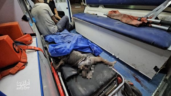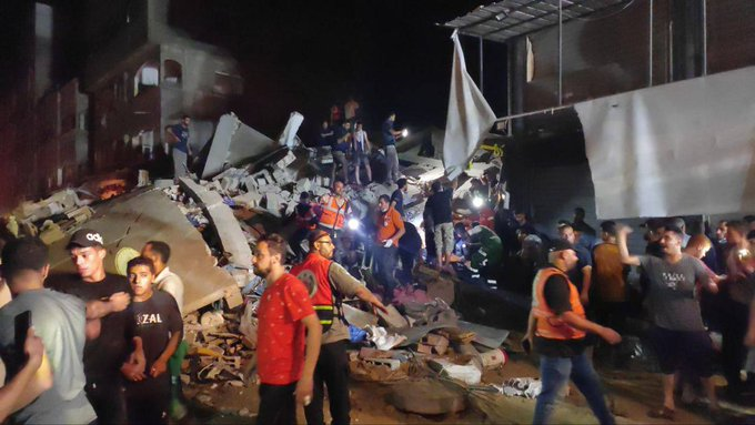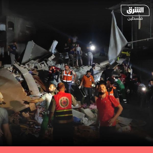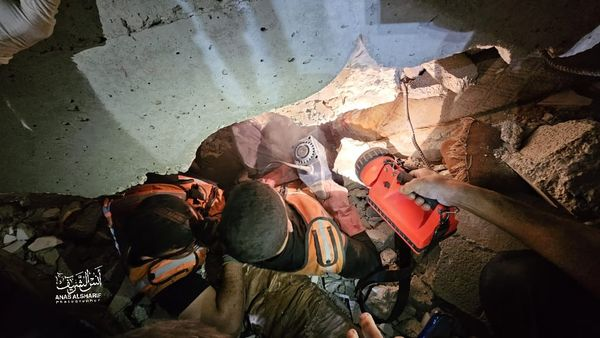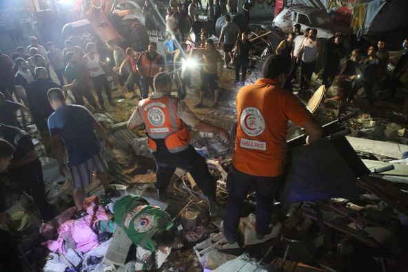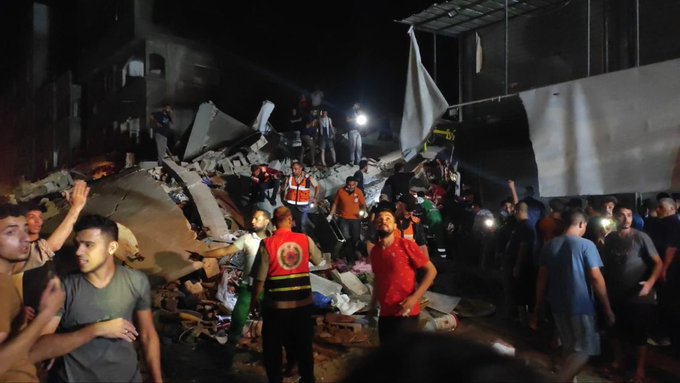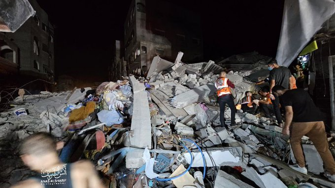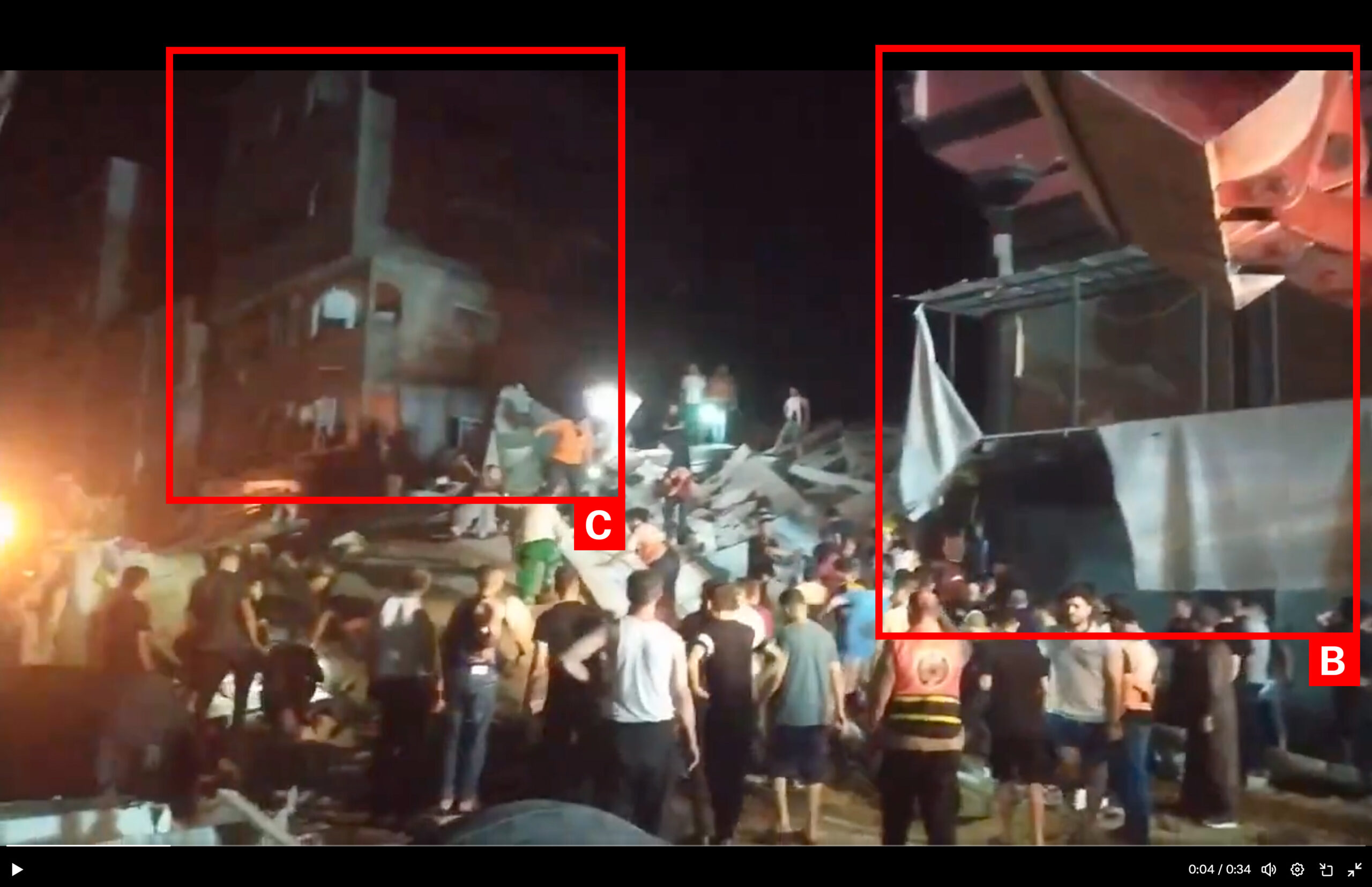 A video posted to Twitter/X by @newsnajah and to Facebook by Alwatan Voice showed a bulldozer positioned at the site, helping to illuminate the pile of ruins while people frantically searched for victims underneath. A photo shared to Facebook by Anas Al Sharif showed the dismembered body of a baby who was killed in the alleged strike.
