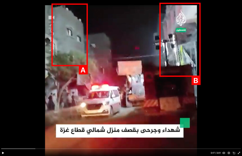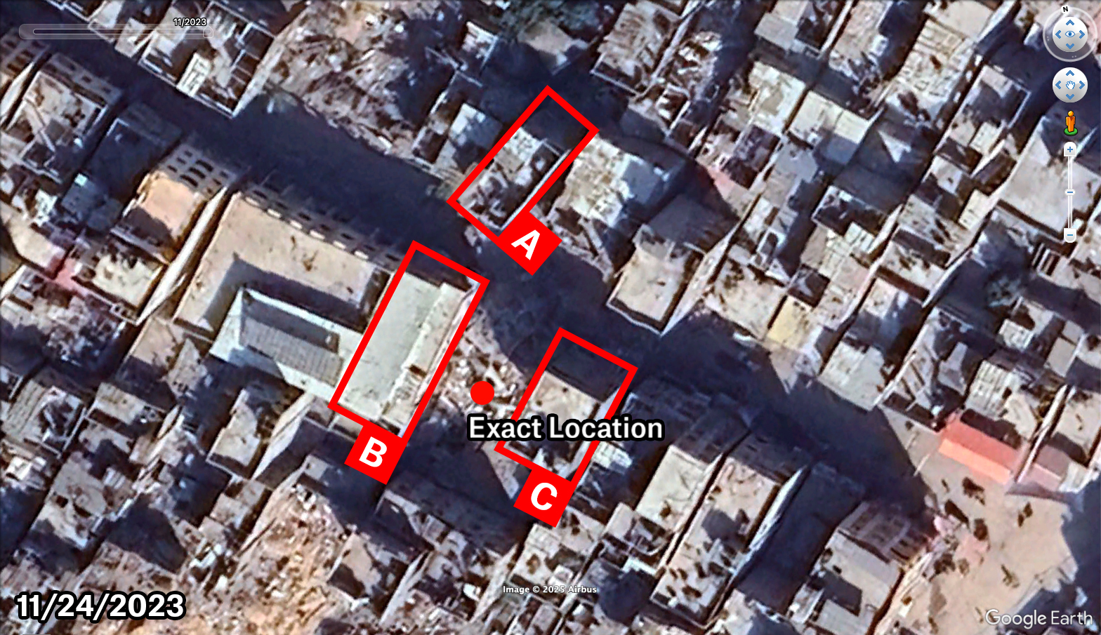 Reports of the incident mention a residential building being struck on Al-Houja Street (شارع الحجة) within the Jabalia Refugee Camp (مخيم جباليا). Analysing audio-visual material from sources, we have narrowed the location down to the following exact coordinates: 31.533723, 34.499399.