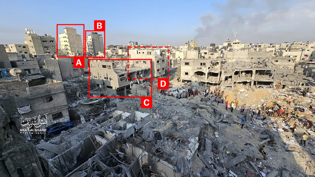 Photos taken by Anas al-Sharif were shared widely, and showed a very large area that was totally flattened amongst tightly packed buildings. These images also showed rescue workers searching under the rubble of the collapsed homes and buildings.