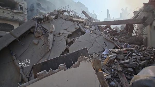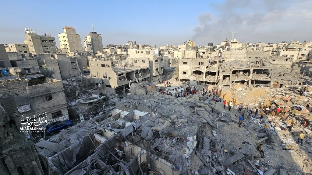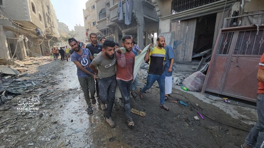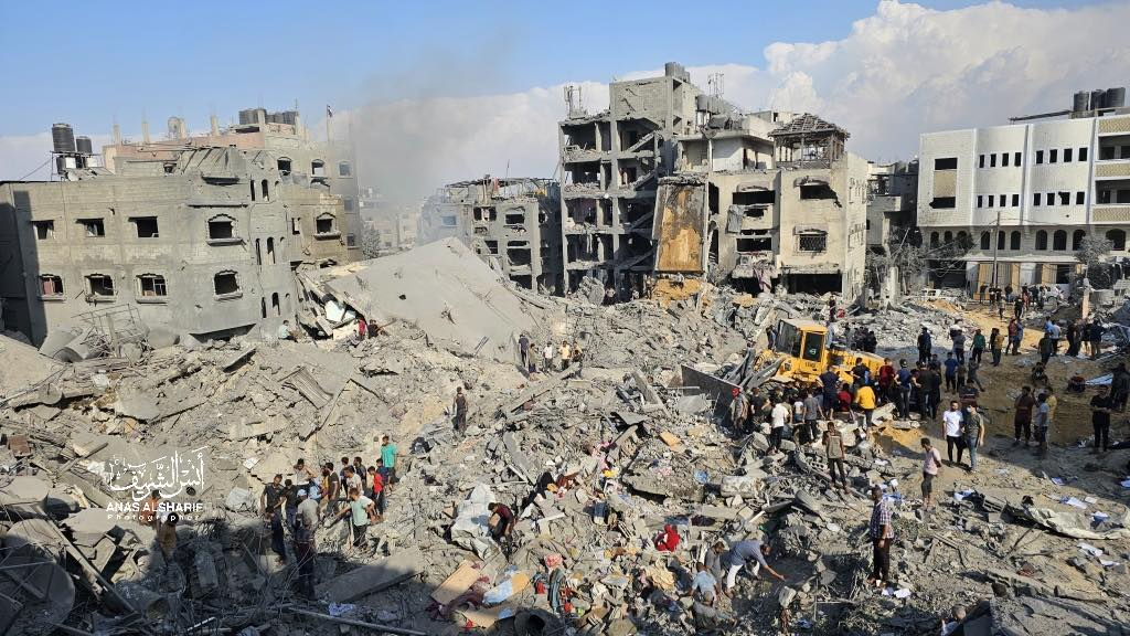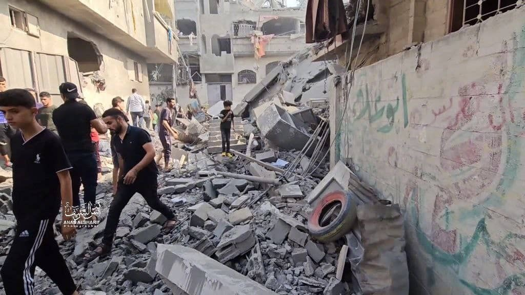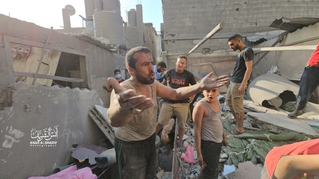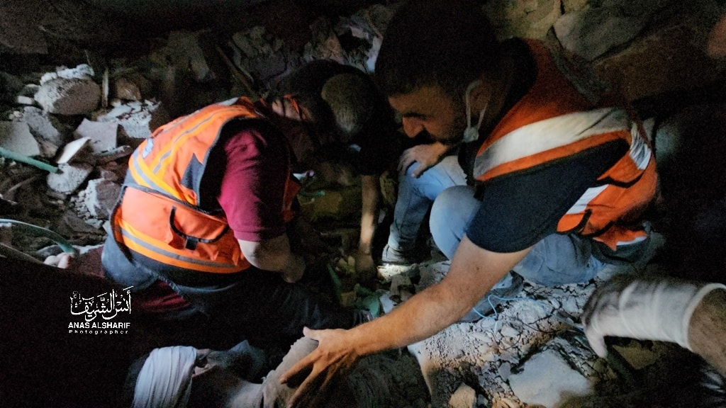 Photos taken by Anas al-Sharif were shared widely, and showed a very large area that was totally flattened amongst tightly packed buildings. These images also showed rescue workers searching under the rubble of the collapsed homes and buildings.