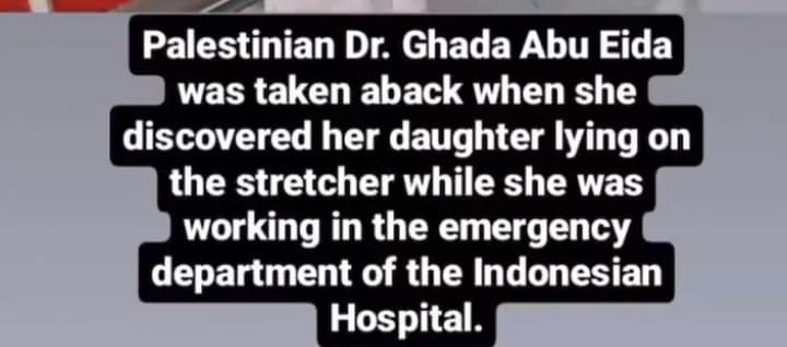 On November 1, 2023, the injured daughter of the Palestinian doctor Al-Hakimah Ghada Abu Eida working in the emergency department at the Indonesian Hospital in Gaza was discovered by her mother as she was brought to the hospital – Dr. Ghada’s daughter was allegedly injured by an Israeli airstrike. It is possible that more of Dr. Ghada’s children were also killed and wounded in the strike.