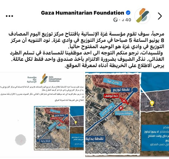 “News of Palestine at home and abroad” re-shared a post from the GHF’s Facebook page, notifying the opening of a distribution centre on that day, in Wadi Gaza. The post reported that the Wadi Gaza site was the “only one currently open.” The Facebook post further detailed that “American forces present inside the aid distribution point south of the Netzarim axis were spraying pepper gas” in the faces of civilians, which “led to a number of them injured by suffocation.” This news was also posted by Rafah City News, Voice of the Nation Radio, and users on social media including @zaid_ hasan and Abu Majeed Abu Ahmed al-Kame, among others.