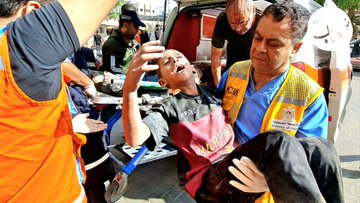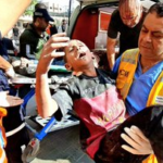 On Twitter/X, Shehab Agency wrote that a number of injured people arrived at the Indonesian Hospital in North Gaza. The post included four images. Two of the images show injured children – a boy and a girl. The third image shows an injured man. In this third photo, the man is walking away from an ambulance, his head and neck bloodied. His presence partially obstructs another individual, who is being carried out of the ambulance on a stretcher. The extent of this individual’s injuries are unknown. The fourth image shows another person covered in blood, whose eyes are closed, largely covered by a blanket, being carried on a stretcher. Twitter/X user Vivalalgerie7 reposted the images.