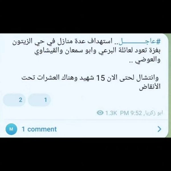 A photo shared by Hebr News showed a scene of huge destruction reportedly at the site of the attack. Multiple homes had clearly been flattened with large craters visible in the ground and piles of rubble from collapsed buildings. A Facebook post from Abdelwhab Fatouh reported that the entire residential square in the al-Shamaa area of al-Zaytoun was bombed in the airstrike.