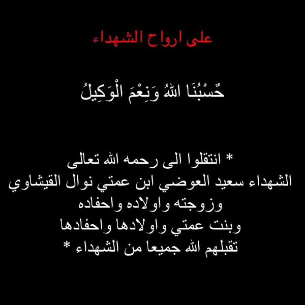 64-year-old Saeed Shabaan al-Awadi and his wife 61-year-old Hanan Noman Najeeb al-Awadi (Umm Shaaban) were reportedly killed with their daughters, 36-year-old Nihal Saeed al-Awadi (Al-Jarousha) and Nawal Saeed al-Awadi (initially mentioned above) and sons Shaaban Saeed al-Awadi and Noman Saeed al-Awadi. Shaaban’s wife, Mandy Badr al-Awadi (initially mentioned above) was also killed alongside their two sons, Saeed Shaaban al-Awadi and 10-year-old Yazan Shaaban al-Awadi and their daughter 13-year-old Hanan Shaaban al-Awadi. Noman’s wife, 31-year-old Alaa al-Awadi (Al-Aji) and their three daughters Maryam Noman al-Awadi, 4-year-old Hanan Noman al-Awadi and Alaa Noman al-Awadi were also reportedly killed in the attack. A post from Hassan al-Awadi indicated that the home which was struck belonged to the elder Saeed al-Awadi.