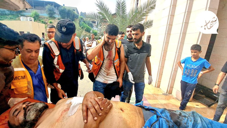 A photo shared by the Shehab Agency shows one of the rescuers with his shirt off being carried on a stretcher into a hospital with other rescuers covered in blood. This is part of a larger incident in Jabalia refugee camp that day.