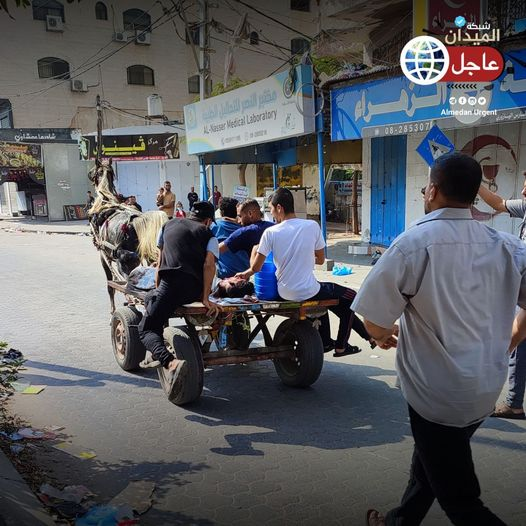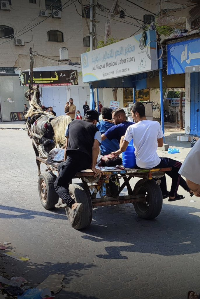 In a Twitter/X post, @waseem_shbak, @mo2re5, and others shared the image of an individual, likely a young man, being transported by a horse-drawn cart, west of Gaza City, near the Bank of Palestine at the Bahloul intersection on Al-Nasr Street. According to the post shared by @mo2re5, the individual pictured was killed, and his name is unknown.
