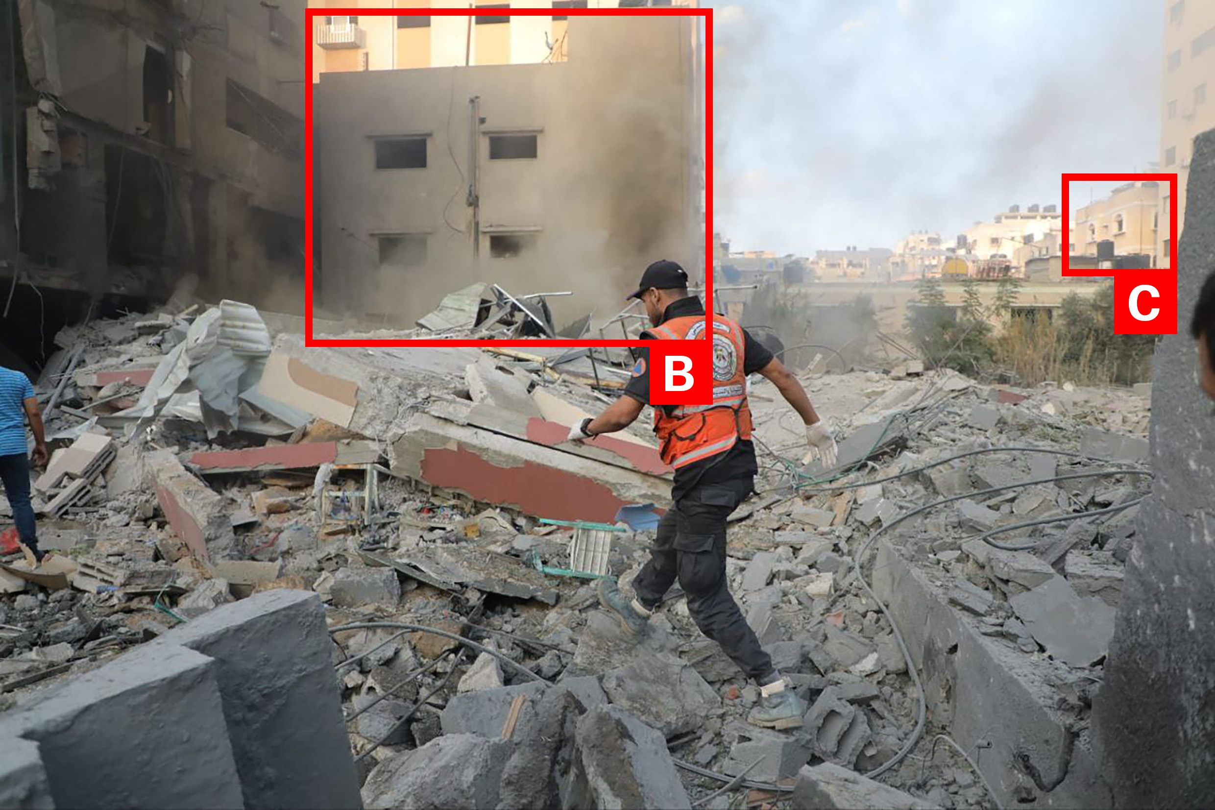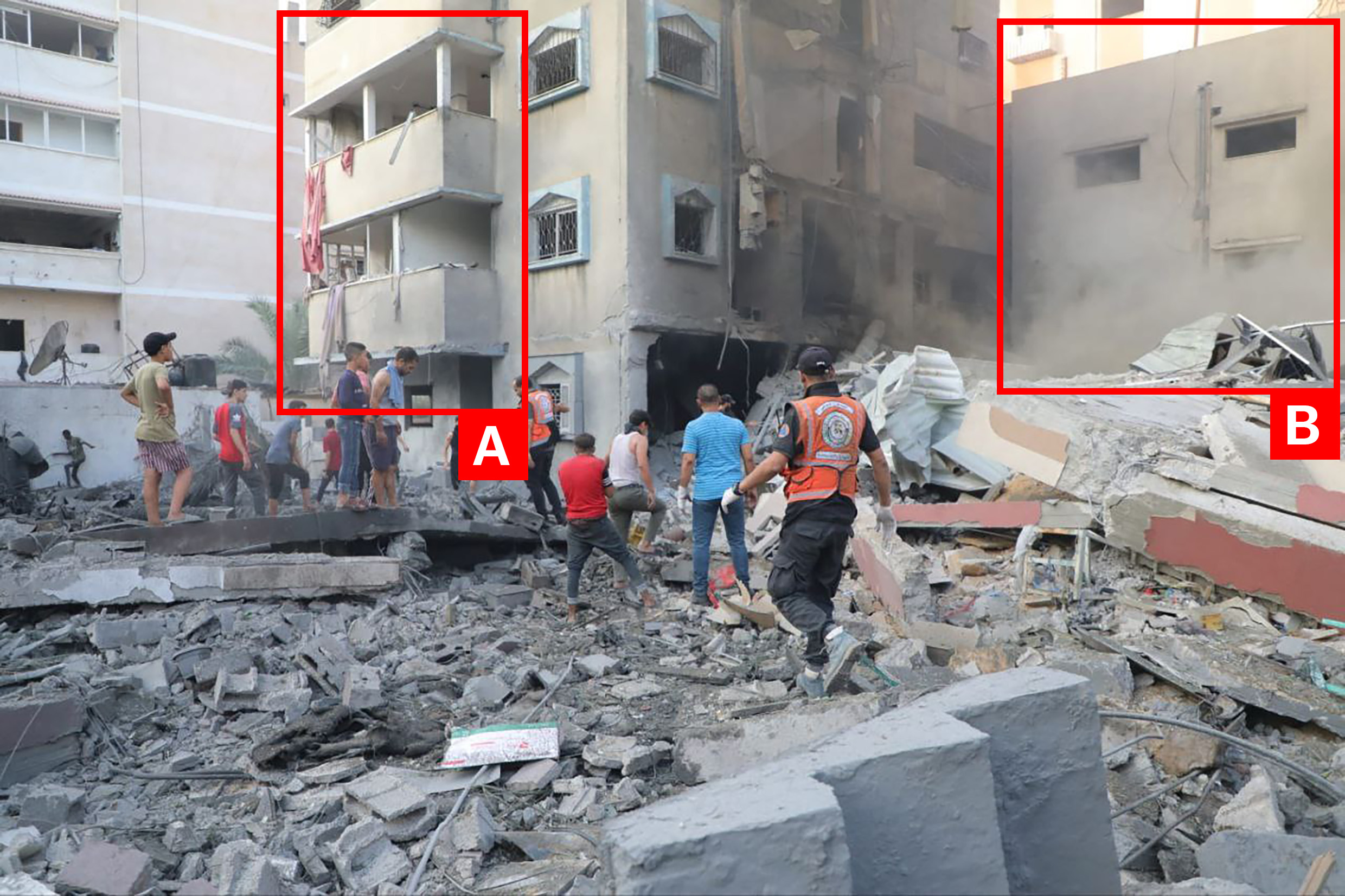 Reports of the incident mention a residential building being struck on Al-Nasr Street (شارع النصر) in Gaza City (مدينة غزة). Analysing audio-visual material from sources, we have narrowed the location down to the following exact coordinates: 31.530034, 34.453554.