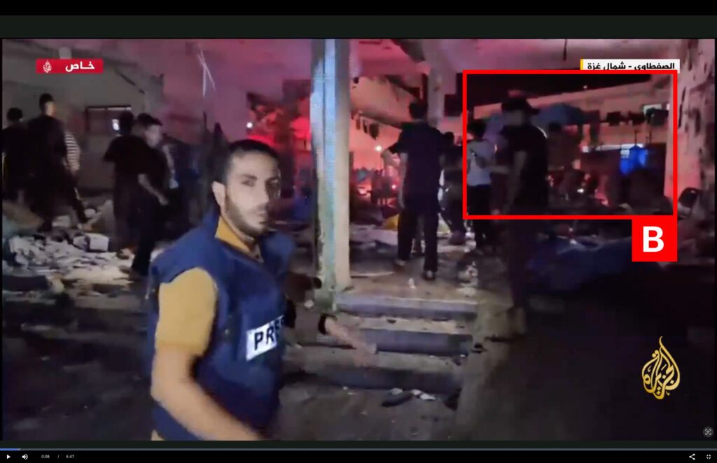 A video shared by the Shehab Agency on Twitter/X showed an injured bearded man whose blue T-shirt was stained with large blood stains and who was asked by a doctor and a paramedic whether there were many injuries in the school. The man confirmed that, indeed, there were many injuries, including children and women, and that he was staying inside the school, in the schoolyard, while the strike hit the school directly.