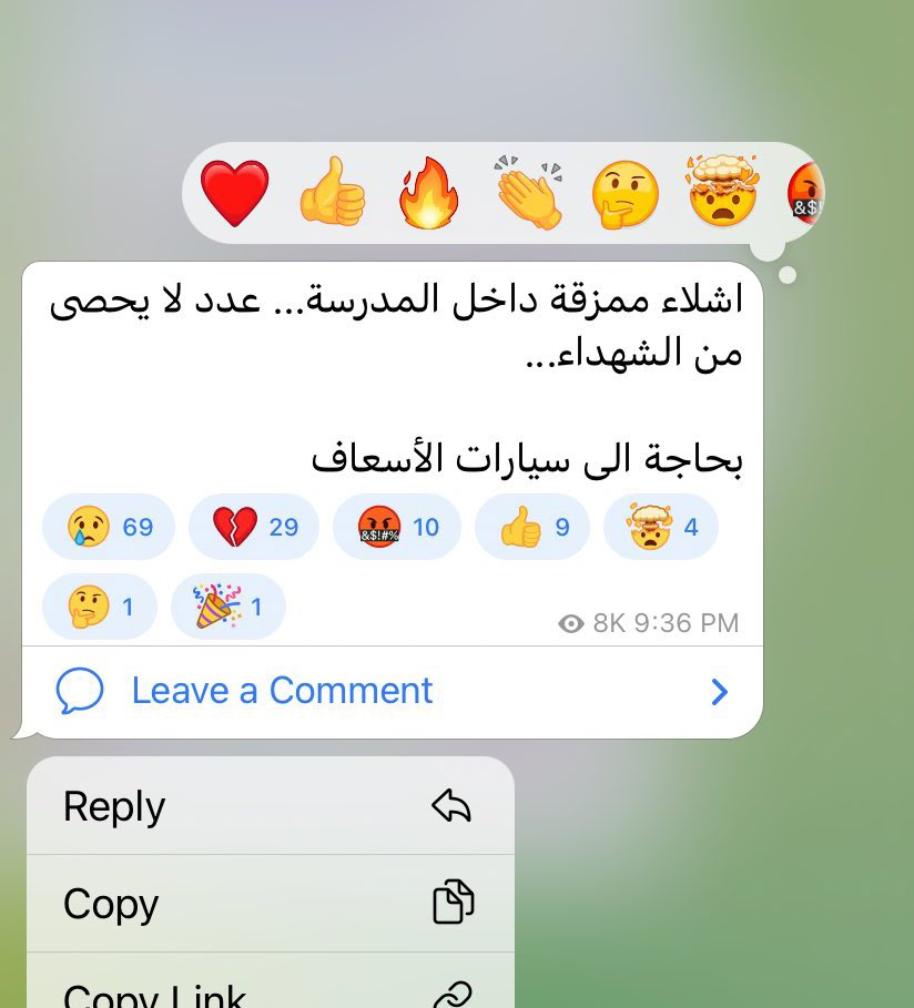 According to Al Watan news, a touching video clip, no longer than 45 seconds, documented by Palestinian journalist Hamza Hammad, showed people screaming while collecting body parts from inside the school classrooms. One of them was holding the shoe of one of the martyrs, shouting: “This blue slipper belongs to one of my family members,” while another cried, saying: “My family members are gone, the enemy killed them, oh God. Where are you, my beloved ones?” This video was shared by social media users but was not published by the media outlet because of its offensive nature.
