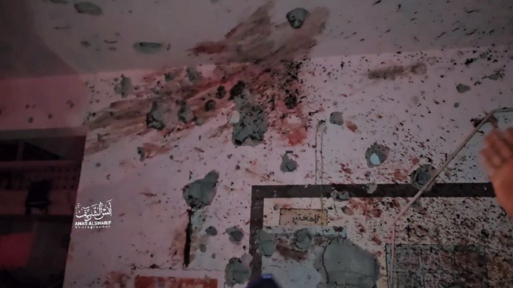 A picture shared several times on social media accounts showed the school’s blood-stained walls and ceiling after the attack. Twitter/X user @Military_OSTX shared next to this also a picture of a pool of blood and a letter written with blood saying “Gaza Resists” in Arabic.