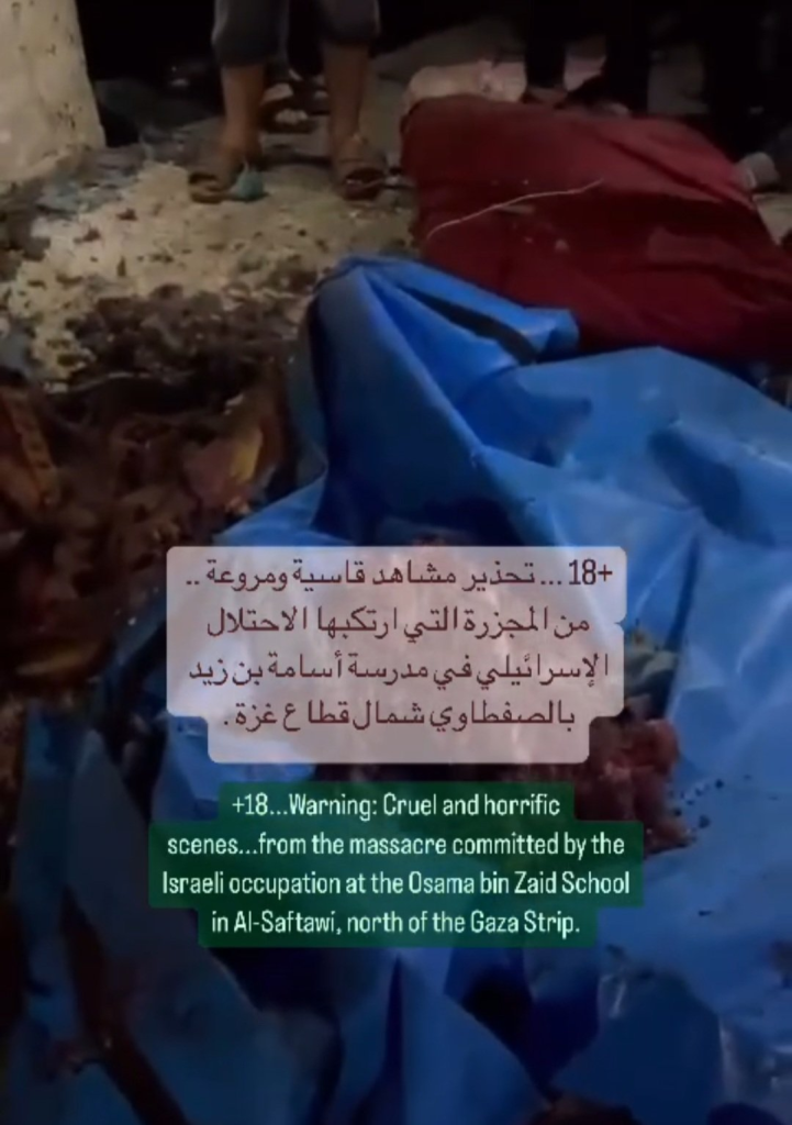 User @M0ATH posted another video with a journalist, Anas al-Sharif, reporting from the school: “We are now in front of Osama Bin Zaid School, in the northern Gaza Strip. The occupation has committed a new massacre against the displaced people here. A large number of martyrs and injured. As you can see, here are the body parts, these torn bodies in this place.” A teenager was emotionally telling the reporter about the death of his cousins: “We were sleeping, all my cousins were sleeping, then the missile hit. Now they’re all in pieces… those are my cousins.”