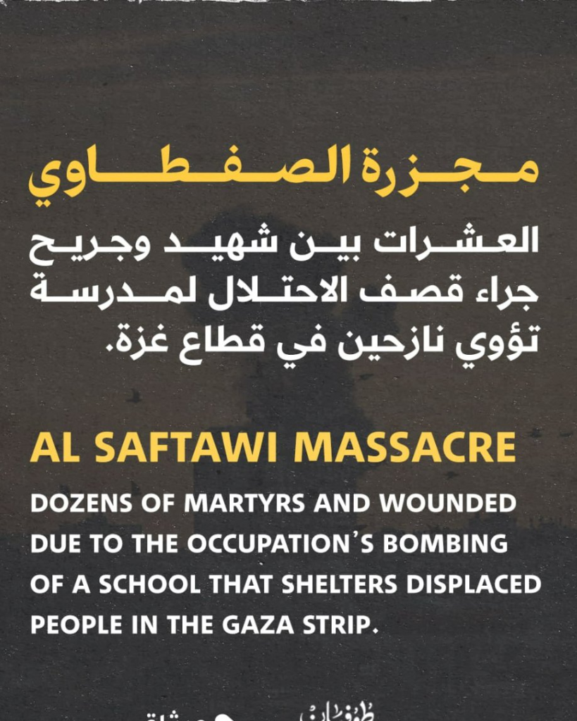 Sources diverged on the exact nature of the attack. While WAFA news and the Club de l’ingénieur Tunisien Mécanique, Energétique et Industriel reported on Facebook that the incident was the result of an attack by Israeli warplanes, AFP News reported that Hamas authorities claimed that it was “Israeli tank shelling that killed 20 people.” Most sources did not provide specifics, reporting more generally about the “bombing” or “bombardment” of the school. Facebook user Abd El Rahim Badri further reported about the use of chemical weapons; however, it was the only source referring to those types of weapons. All sources that referred to the incident’s location reported that the school was in the al-Saftawy area in the north of Gaza City.
