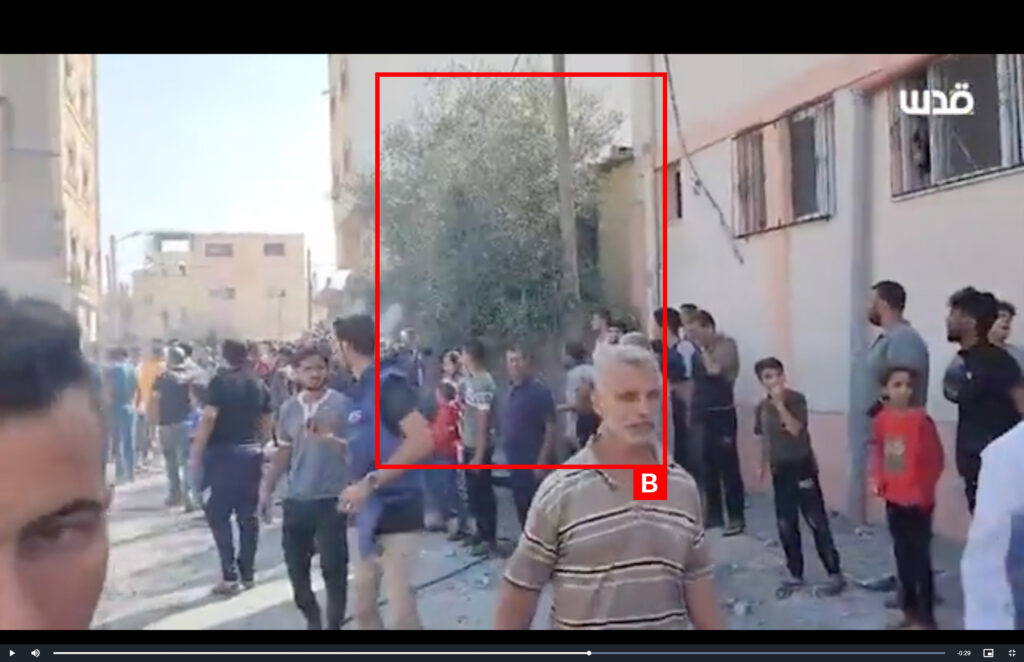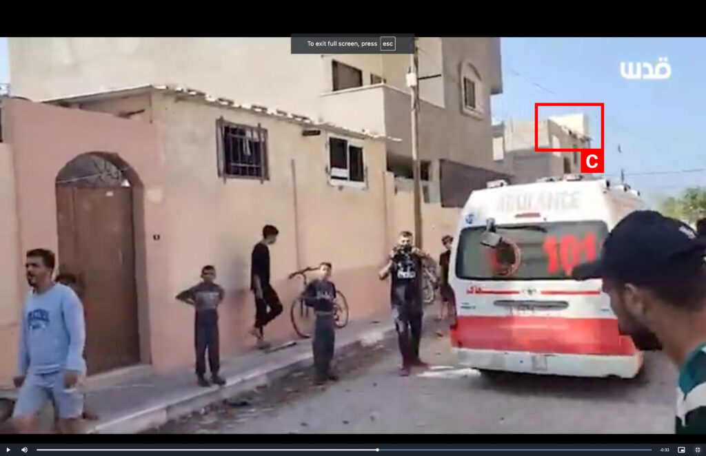 Reports of the incident mention a residential building being struck in the Japanese neighbourhood (الحي الياباني) in Khan Younis (خان يونس). Analysing audio-visual material from sources, we have narrowed the location down to the following exact coordinates: 31.360654, 34.291391.
