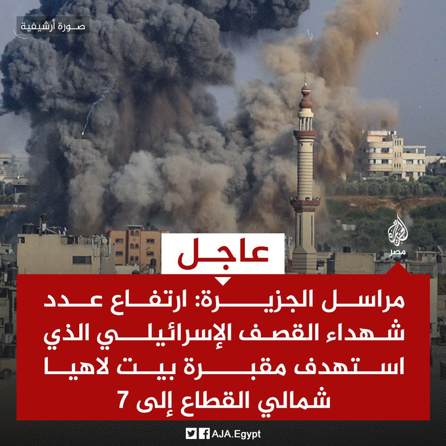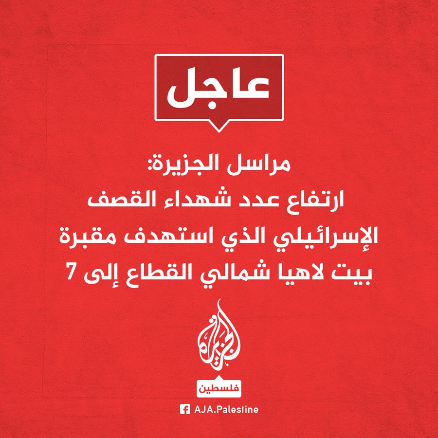 Multiple sources including @AJA_Palestine reported that the death toll of the bombing of the Beit Lahia cemetery had risen to seven while @AlarabyTV stated that the bodies of 10 of those killed had been transferred to hospitals in North Gaza.