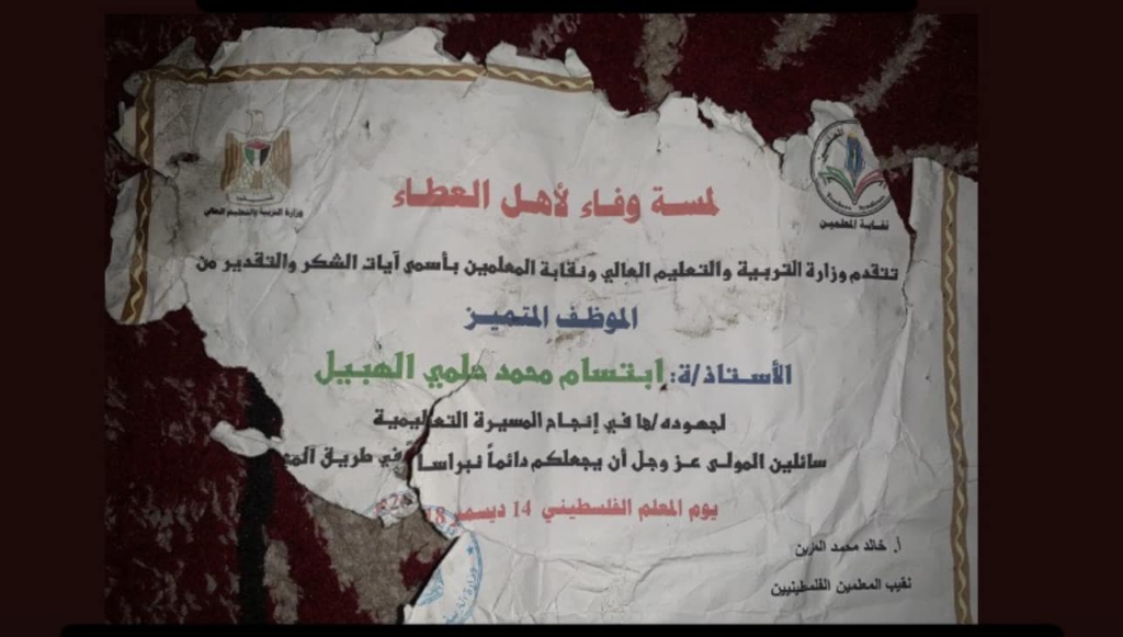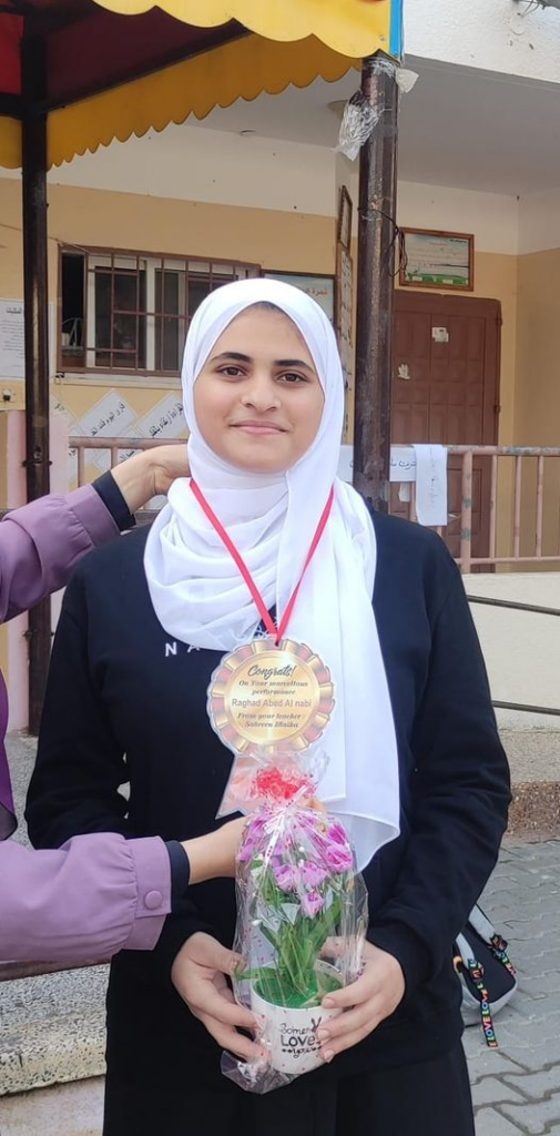 According to a proud post on Ibtisam Mohammed al-Habil’s Facebook page from July 2023, her daughter Raghad Anees Abd al-Nabi had just graduated from high school with exceptionally high grades, achieving a GPA of 98.6 in the sciences, and had been accepted to study medicine. She had graduated from school among the top ten students in the al-Bureij camp. Following her death, Sama al-Qreenawi wrote, “You were the smartest and best among us in the class and at school, and you were definitely going to be at university as well. And now you are the best among us in the sight of our Lord.” Jode Nael paid further tribute, describing Raghad Anees Abd al-Nabi as “the best companion, friend, and beloved, affectionate, kind, generous, with good qualities from a good family. May God make it easy for you, my sister, and have mercy on you and accept you into the heavens. My heart cried for you before my eyes, Raghad. God willing, you and your family will live in heaven, Raghad. May God give us patience for your separation… We met for the love of medicine, but the world separated us.” Umm Khalil, who had taught Raghad Anees Abd al-Nabi, also mourned her, writing “My polite, well-mannered, delicate, intelligent student, who combined the qualities I loved so much, the student: Raghad Abdul Nabi, was martyred, leaving behind a dream she aspired to achieve, to become a successful doctor serving her country.” She also posted a photo of Raghad Anees Abd al-Nabi upon her graduation, smiling and wearing a congratulatory rosette from one of her teachers.
