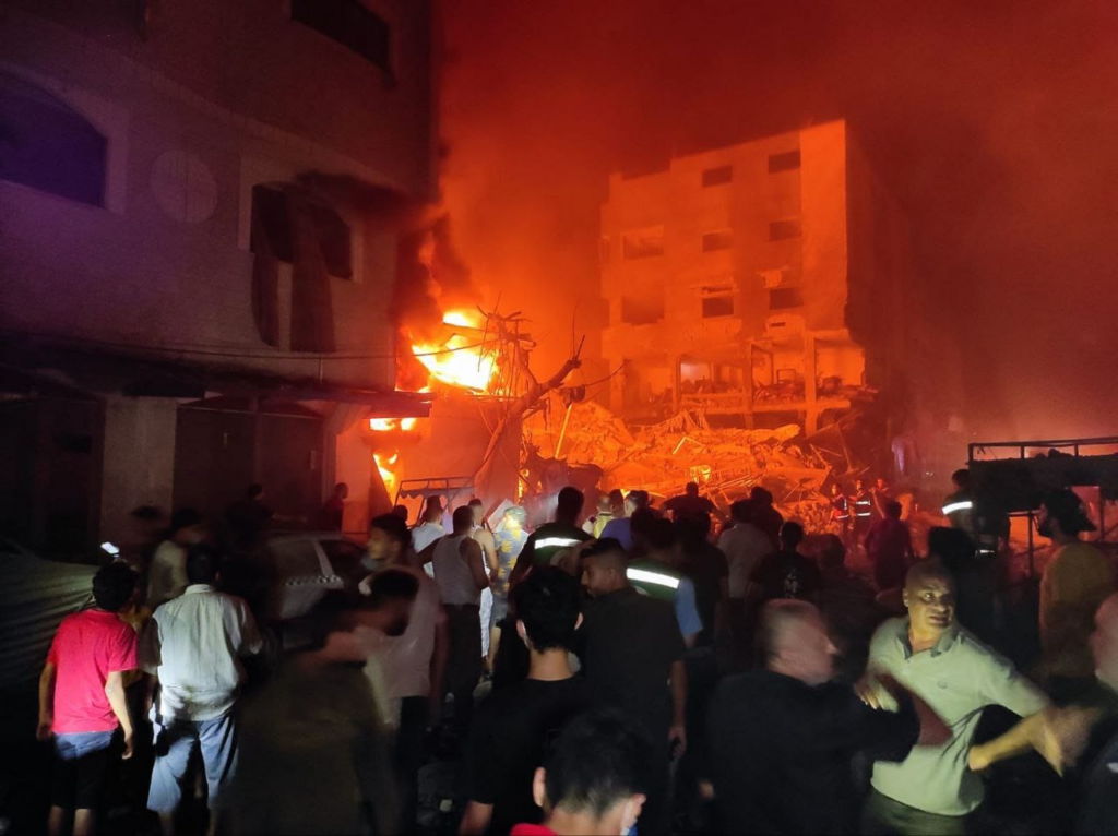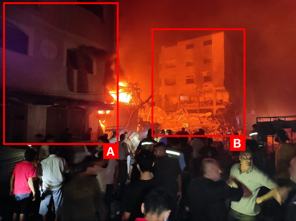 Qatari news network Al Jazeera posted a video on Facebook depicting the same scene. The video showed a large crowd of people, including the Civil Defense, frantically searching through the rubble of the destroyed building as smoke billows around them. Firefighters simultaneously attempted to tackle the blaze. The video also showed extensive damage to surrounding buildings, possibly caused by the same strike.