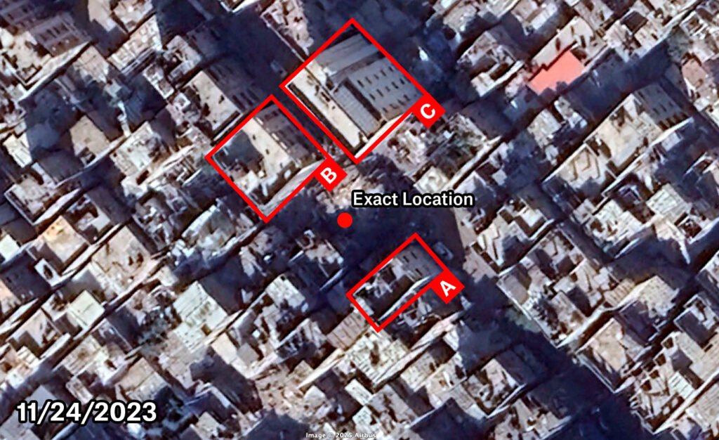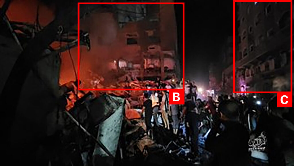 Reports of the incident mention a residential building being struck on Al-Houja Street (شارع الحجة) in the Jabalia Refugee Camp (مخيم جباليا). Analysing audio-visual material from sources, we have narrowed the location down to the following exact coordinates: 31.535191, 34.497289.