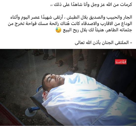Abo Moza described “my friend and neighbor, the martyr Bilal Jamil al-Tabash” as “well-mannered.” Relative Ahmed Massoud grieved “the martyrdom of my wife’s uncle, Bilal Jamil al-Tabash, may Allah have mercy on him.” Mohammed Kamal Amer wrote “my eyes shed tears, my heart grieves, and I am saddened by your departure. The martyrdom of my dear friend. May God have mercy on you, my dear.”