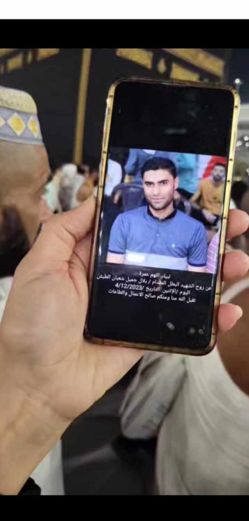 On December 5, 2023, Sha’aban al-Tabash honored his memory with “Umrah [pilgrimage to Mecca] in the spirit of my brave martyr brother Bilal Jamil al-Tabash.” In a Facebook post, Sha’aban shared a photo of a hand holding up a cell phone in front of the Kaaba in Mecca, with a smiling photo of Bilal beaming on the screen.