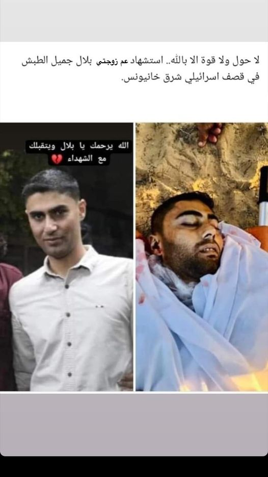 Um Seraj Um Seraj shared a smiling photo of Bilal as well as a picture of the young man’s body after he was killed and announced that “my cousin Bilal Jamil al-Tabash was martyred in an Israeli bombardment in eastern Khan Yunis. May Allah have mercy on you, cousin, and grant you Paradise.”