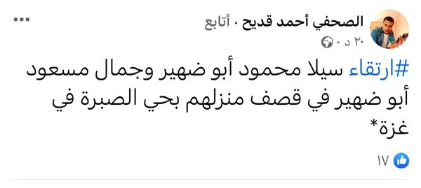 According to @ShehabAgency, “[Israeli] aircraft targeted a house for the Abu Dhahir family in the Al-Sabra neighbourhood…and there were a number of martyrs and wounded at the place.” Other sources reported this as well. On Facebook, ِAl Sahafi Ahmed Qudieh announced “the martyrdom of Sila Mahmoud Abu Dhahir and Jamal Masoud Abu Dhahir in the bombing of their home in the Sabra neighbourhood in Gaza.”