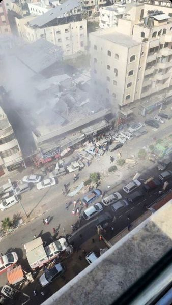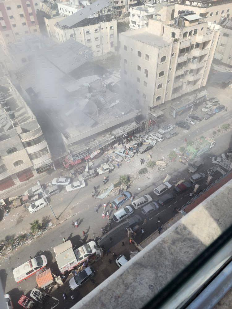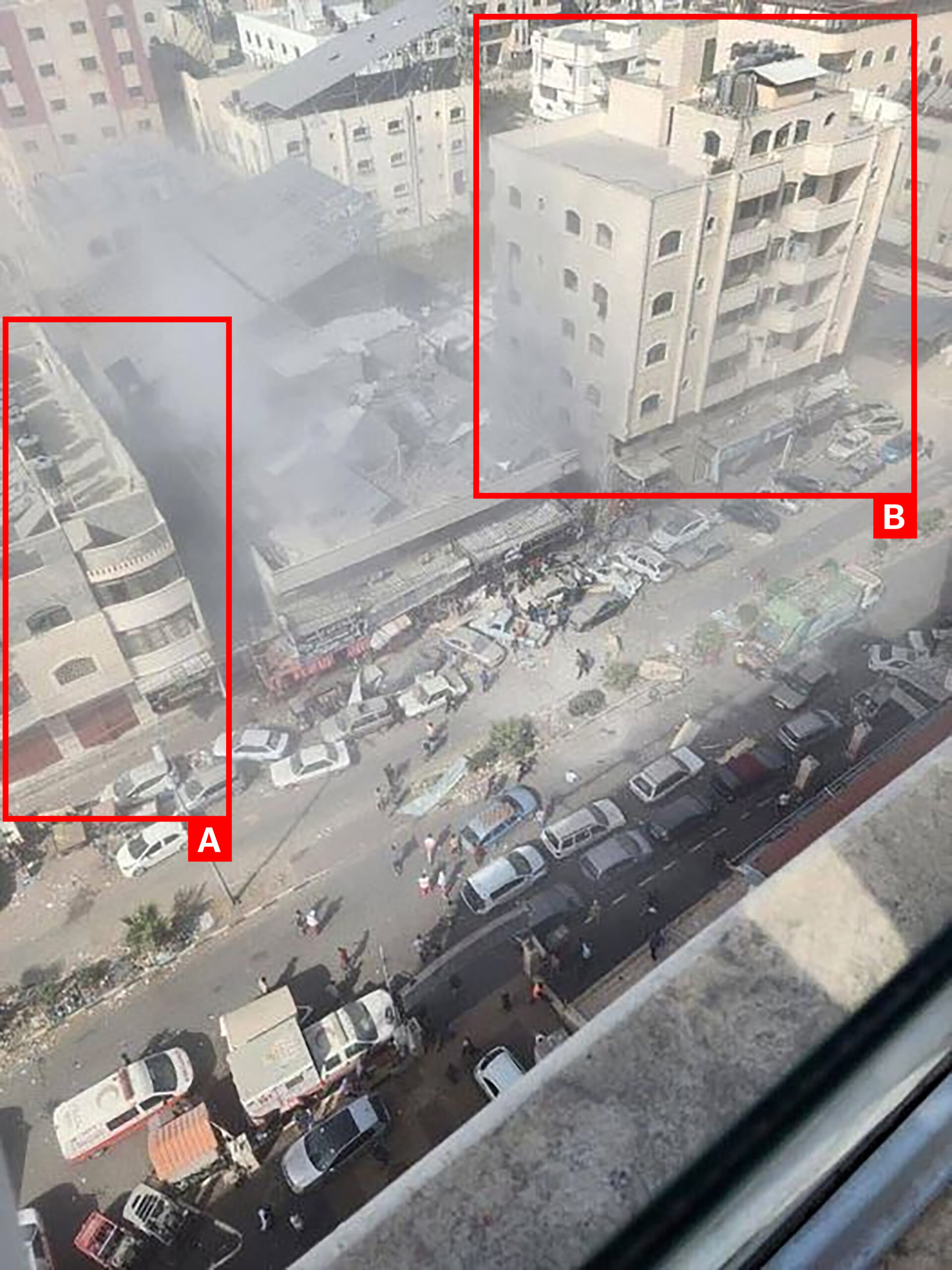 Shehab Agency Twitter account reported the incident occurred in front of the gate of Al-Quds Hospital in Tal al-Hawa neighbourhood, southwestern of Gaza City. Facebook user Khalid Hindam stated that the building struck was across the street.