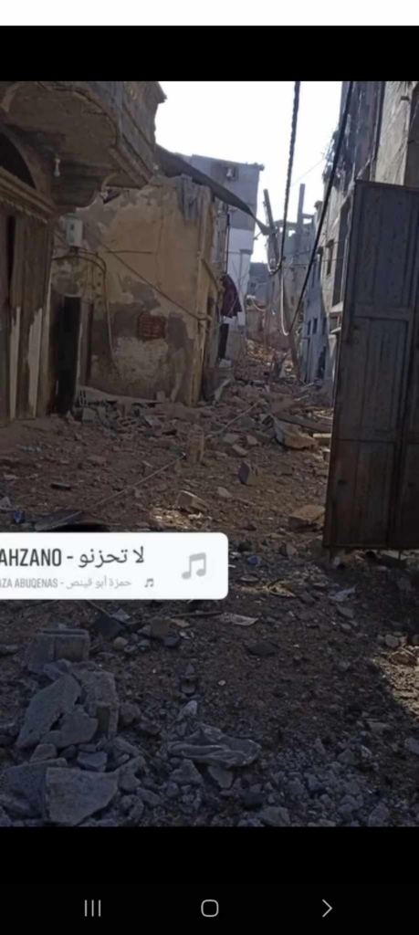 According to a post by Shadi Press, the Aslim family home was one of four houses in Gaza that were hit by airstrikes over an hour. Mahmoud Al-Sarsak posted to Facebook, “Our family street in Shuja’iyya neighbourhood (Mansoura) is a ghost town after the destruction and bombing that befell it…”, along with several pictures of a street lined with rubble and debris.