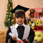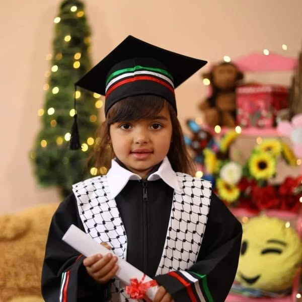 One tribute by user @zahara city on Facebook shared a collage of photos, including an image of Misbah Al-Hato at a desk in a white T-shirt and navy blue puffer vest. Another photo in the collage shows his three children holding hands, with their younger sister in the middle wearing a pink top, all smiling at the camera. Another image in the collage shows the younger sister wearing a cap and gown adorned with Palestinian colours in a graduation-inspired photograph, holding a certificate and smiling at the camera. This collage was shared with a caption calling Misbah a “well-mannered, polite young man,” expressing sadness at his and his family’s deaths and hoping that “their souls rest in peace, and may their loved ones have patience and solace.”