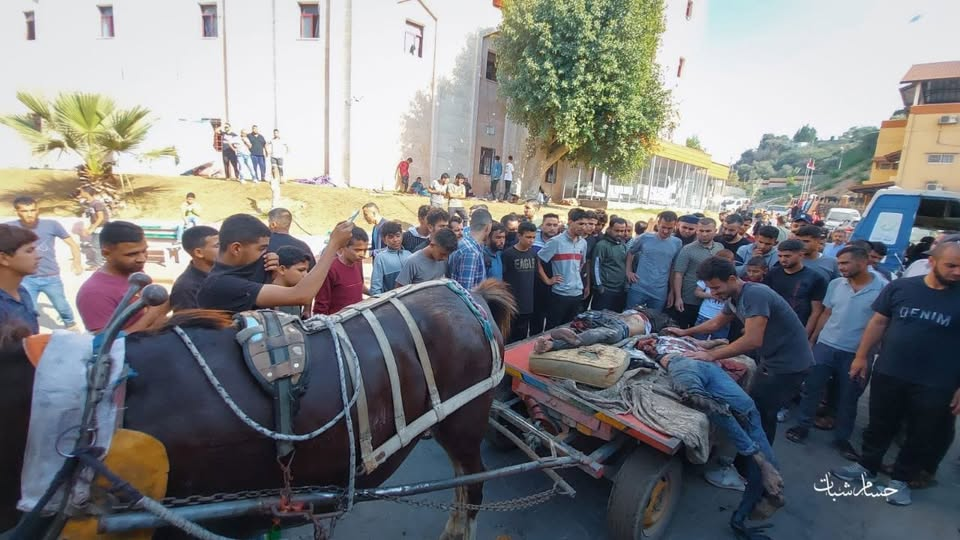 Victims were rushed to the Indonesian Hospital, though reports on the number of casualties varied. Yemeni Press and Al-Masirah’s Twitter/X reported “at least two” deaths, while Al Jazeera Egypt and Palestine TV stated that three people had been killed. Similarly, the Shehab Agency and MSDR News also reported three victims and shared a graphic image showing two male bodies, clothed and covered in blood, lying atop a horse-drawn cart. A crowd of bystanders surrounded the cart, with one man placing his hands on a victim’s stomach and face.
