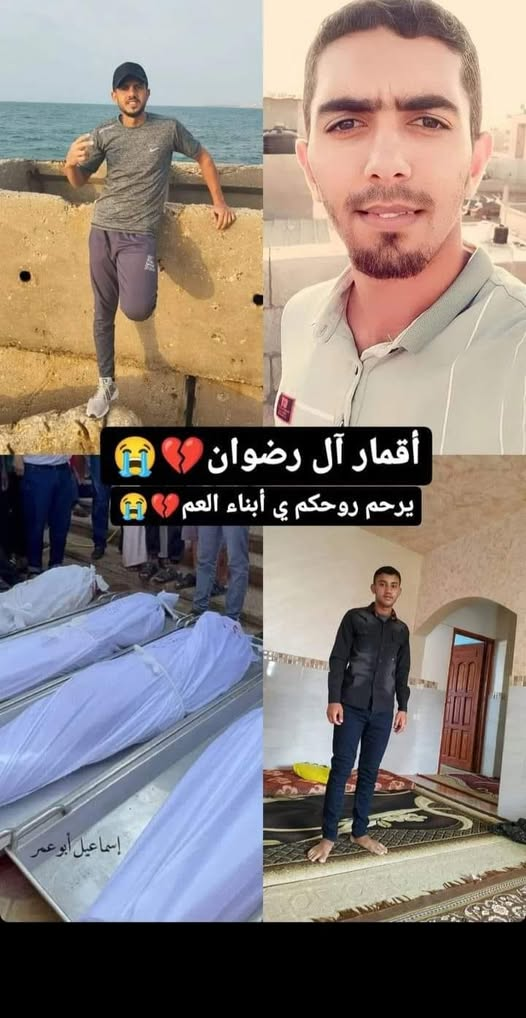 Numerous friends and family members mourned those killed on social media. Among them, Noor Aldeen Radwan wrote on Facebook, “May God have mercy on you, Rateb [Rateb Raafat Radwan]. I don’t know what to write about you. You used to call me Abu Qatada as a joke. You were the only one who called me that. Our memories are not for a day or two, but a million situations. We never quarreled or had problems. Not for a single day. There was no one kinder than your heart. My brother’s honor. He told me on Thursday that he was still asking about you. Forgive me, Rateb. I’m the one who was supposed to ask about you, but I understood your situation and I prayed for God to protect you. From the first time you chose your path, every time I saw you I would say, Rateb is a martyr walking on earth, and God chose you because you were honest with Him. May God have mercy on you, my love. You, Abdul Rahman [Abdul Rahman Jamal Radwan], Radwan [Radwan Jamal Radwan], and Murad [Murad Muhammad Radwan]. By God, there is no one with your morals or like you. You are blessed. You are blessed, God willing, in the gardens of eternity with the rest of the young men of the family.”