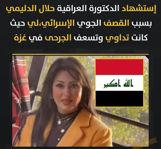 “With hearts wracked by pain, we received the news of the martyrdom of Dr. Halal Al-Dulaimi while she was fulfilling her duty of tending to the wounded in afflicted Gaza, struck down by a treacherous Israeli bullet.