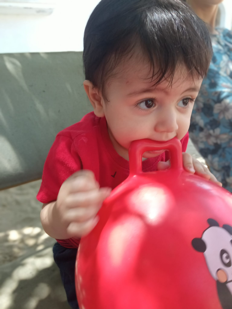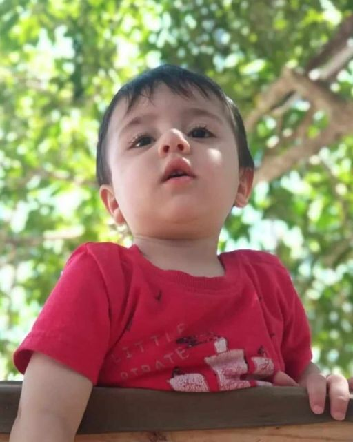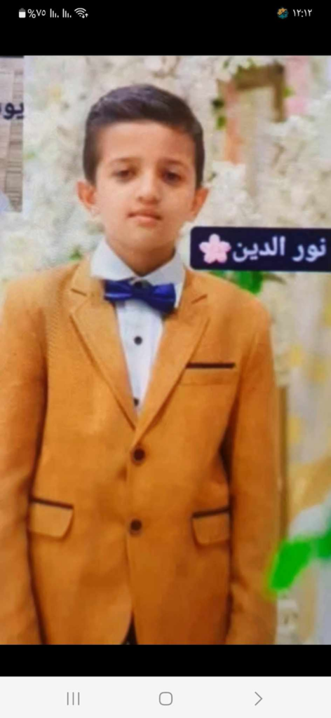 An older photo of Nour Ayman Sammour, appearing to be around three years old at the time, contrasts with a more recent one, where he is seen proudly wearing a brown suit and bowtie. In another photo, seemingly taken around the same time, he sits on a patio, smiling at the camera alongside another boy who appears to be about the same age.