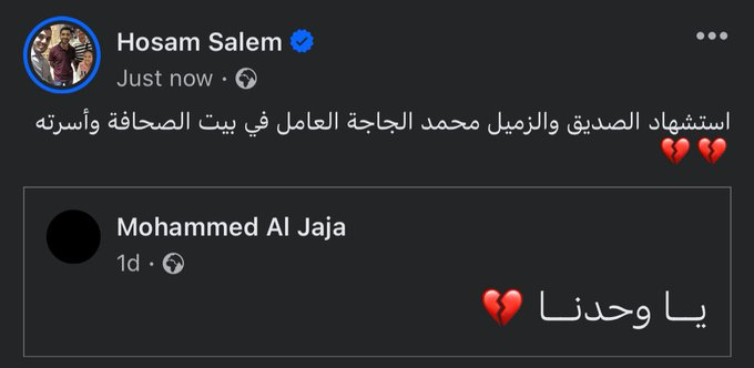 Atef Abu Saif, who claimed to have been with Muhammad Al-Jaja the day before the alleged strike, wrote in a farewell Facebook post: “He was busy all the time providing assistance to the afflicted in shelter centres, calling and going to bakeries and supermarkets. From seven in the morning until sunset, he is busy with the worries of others. He refused to move south and remained steadfast in his home in the Al-Nasr neighbourhood until the shell came and killed him and his family”. He ended his message by writing: “In Al-Shifa Hospital, the press jacket over his body with his identification card reminds us of all the pain that awaits us on the road.”
