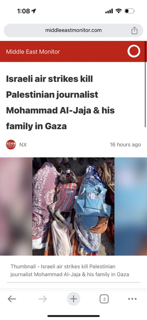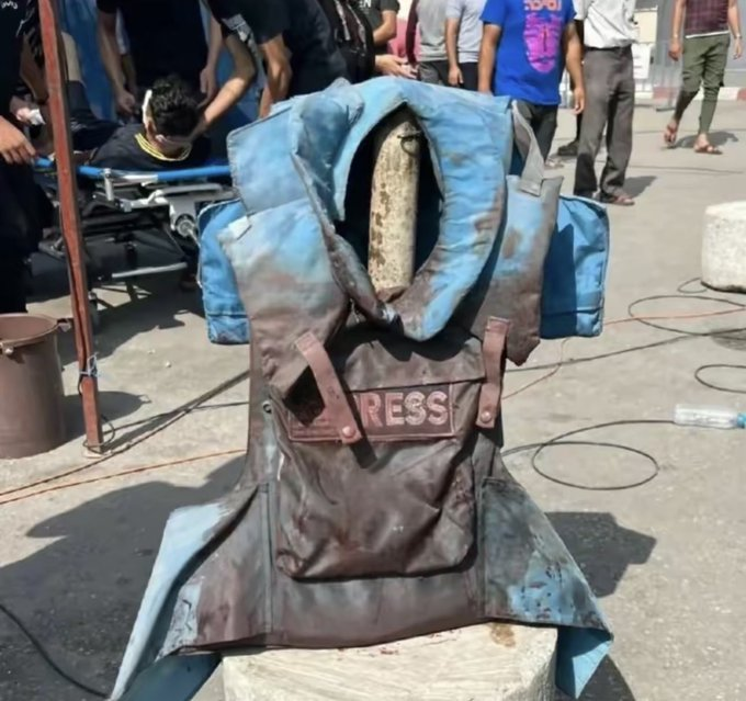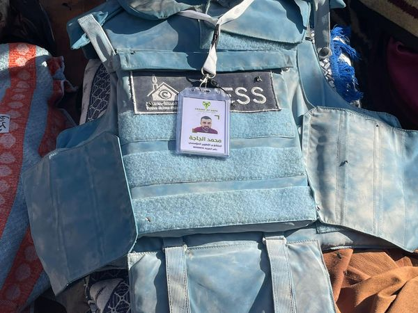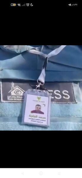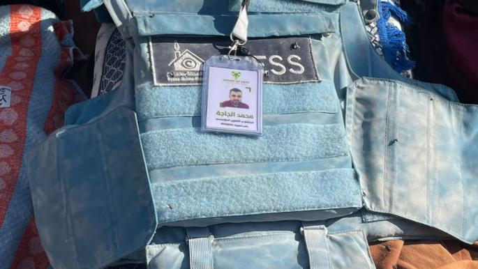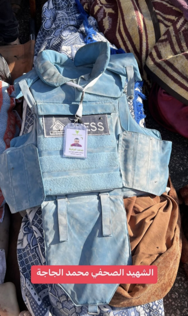 A graphic video showing at least five corpses lying on the ground and covered with blankets was widely circulated on social networks. Muhammad Al-Jaja’s blue vest and press ID were placed over one of the bodies. To the left appear to be the bodies of two infants sharing the same stretcher.