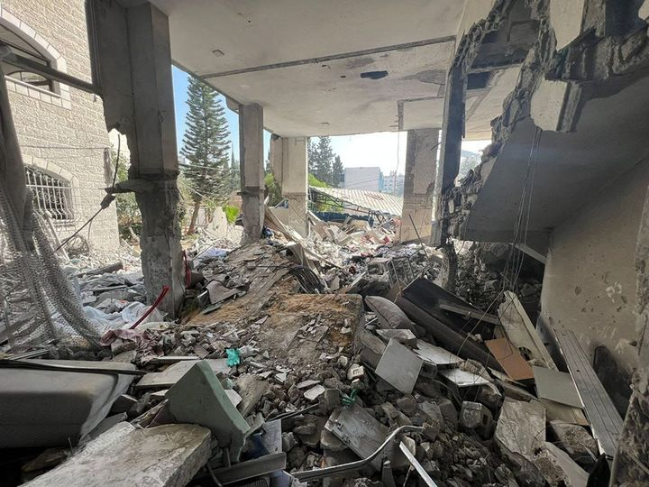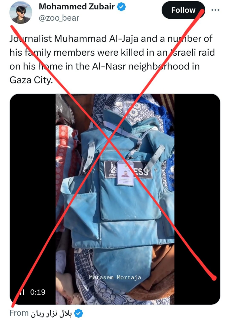 The post included two photos of a severely damaged building. A similar image was shared by the Facebook account MsdrNews: “The effects of the bombing that destroyed the house of fellow journalist Muhammad Al-Jaja, opposite Al-Shifa Tower, which led to the martyrdom of him and his family.”