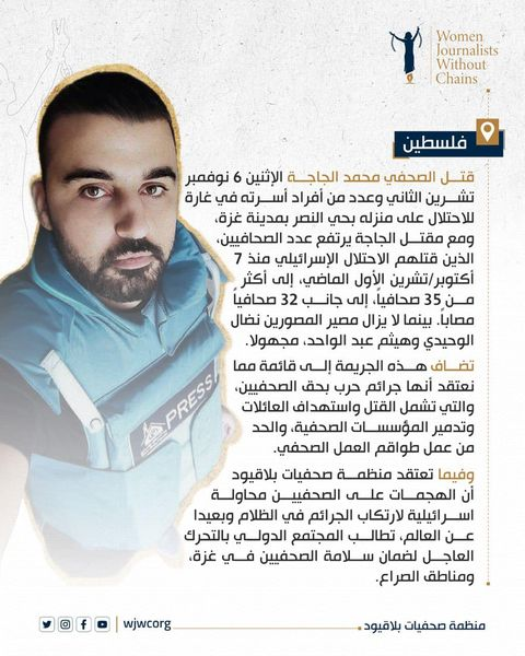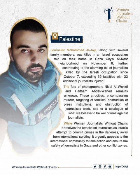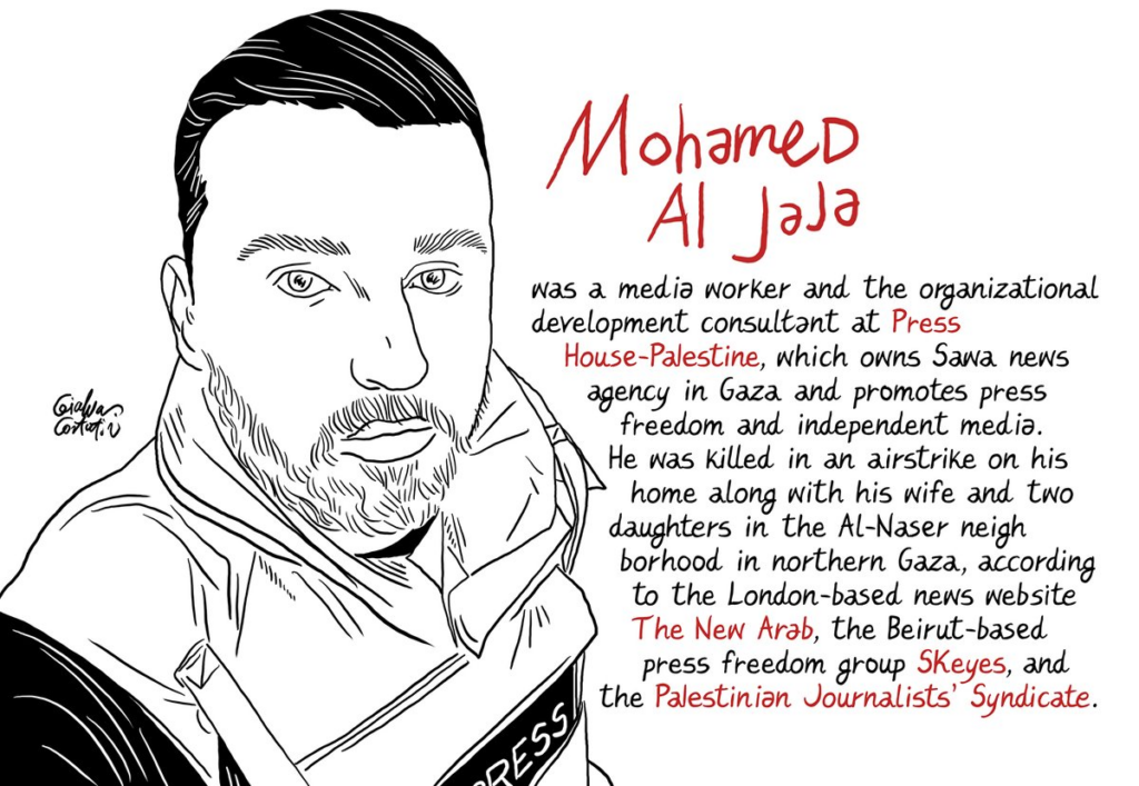 On the evening of Monday, November 6th, 2023, journalist Muhammad Ghanem Tawfiq Al-Jaja was killed after an alleged Israeli airstrike hit his family home in the Al-Nasr neighbourhood in Gaza City. The alleged strike killed 12 other members of the Al-Jaja family, including four children and five women, one of whom was pregnant, and injured at least one other member of the family.