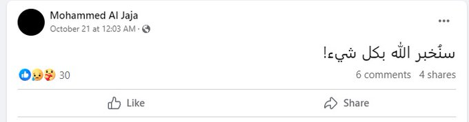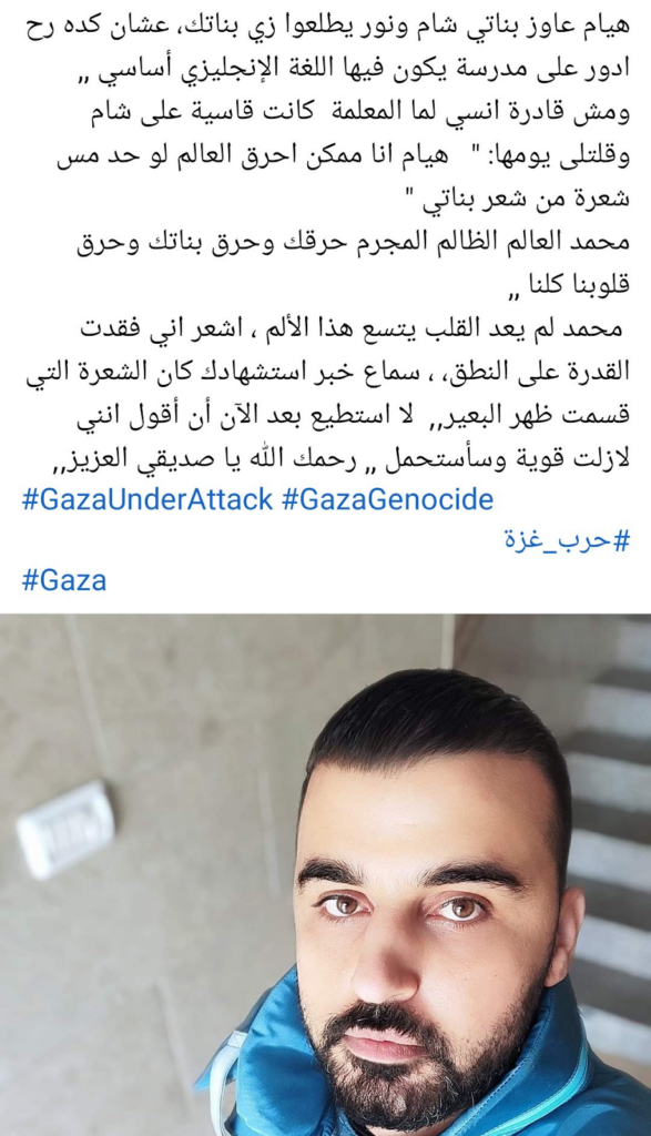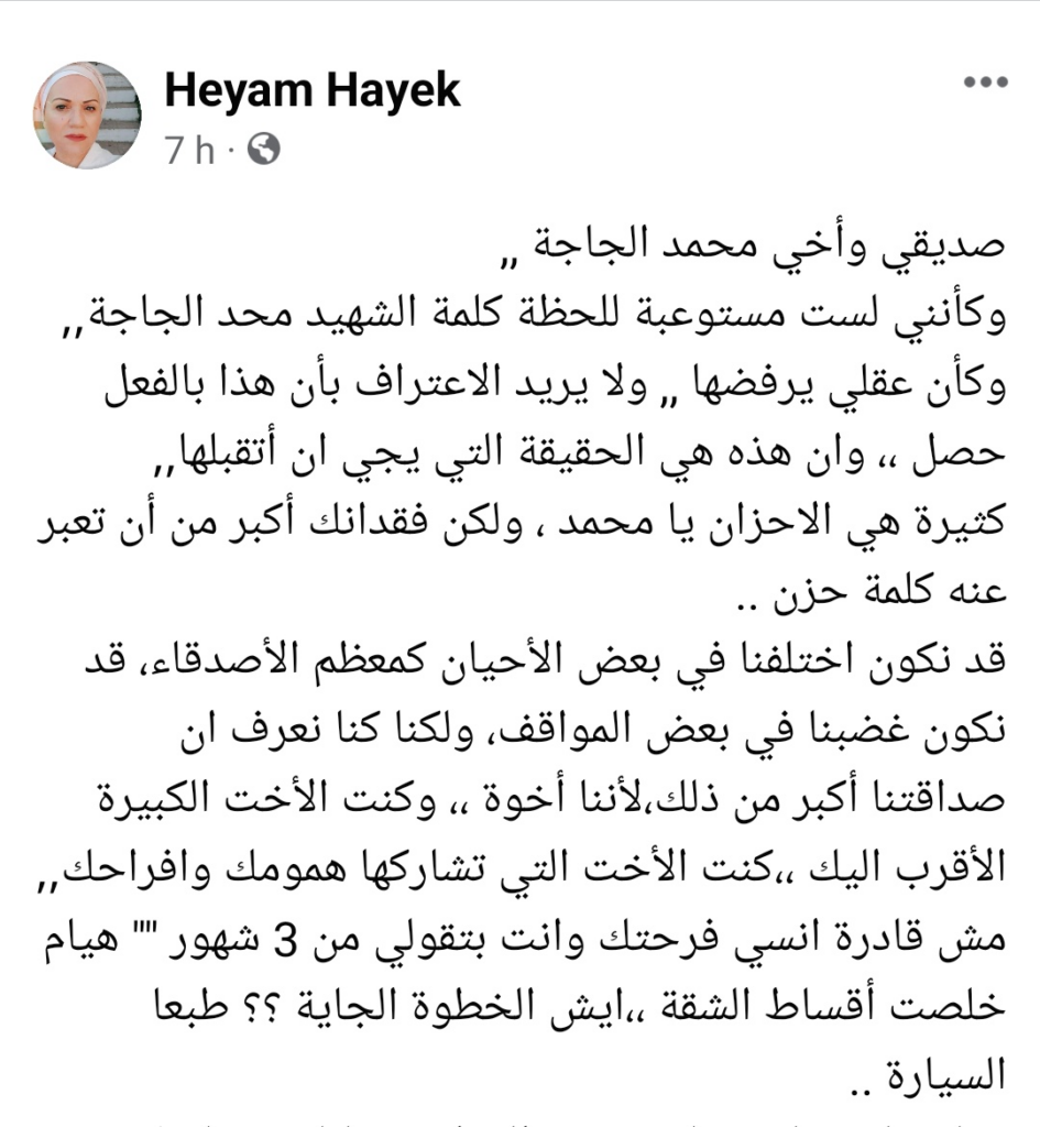 A message of condolence shared by Shaymaa Ghanem Al-Jaja, Muhammad Al-Jaja’s sister, detailed each of the 13 relatives she lost on the 6th of November. “The eyes shed tears and the heart grieves, and we are saddened by your separation.”