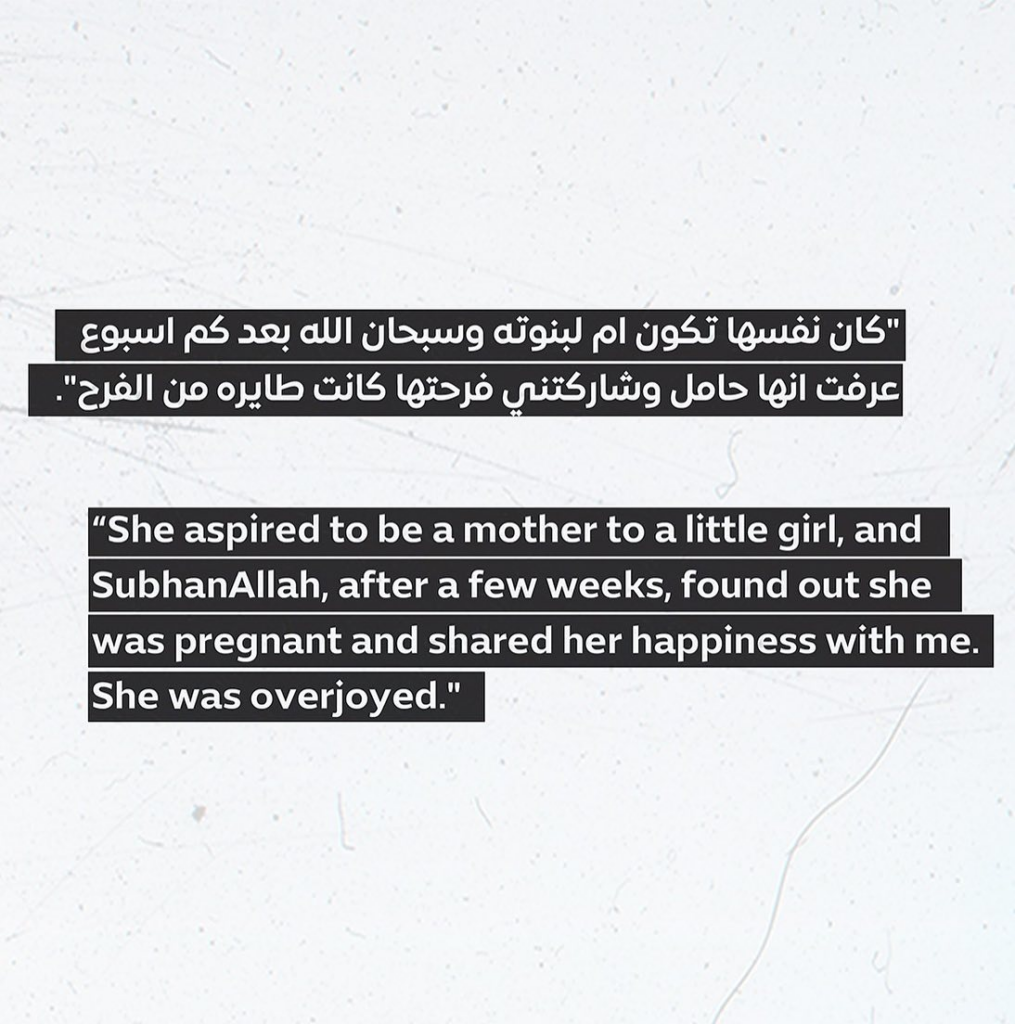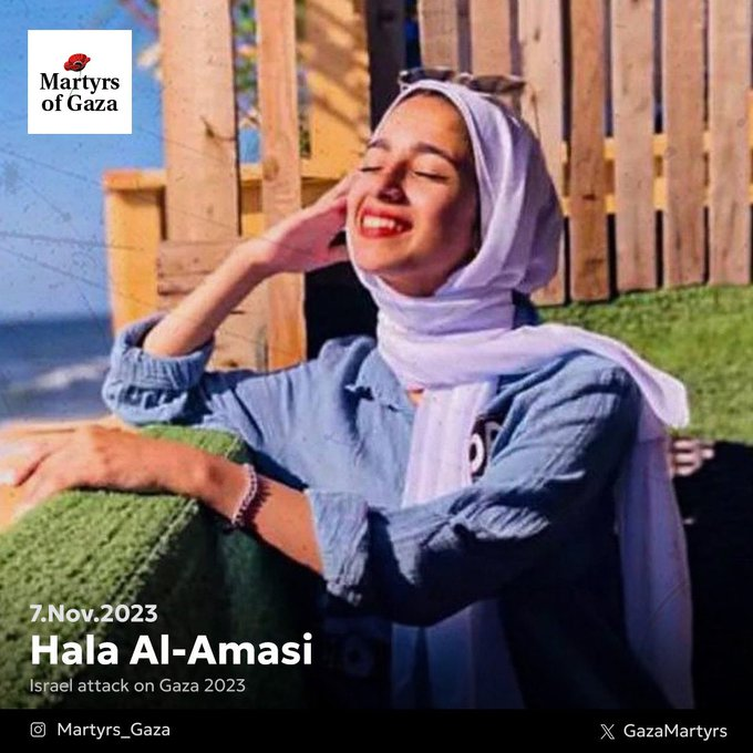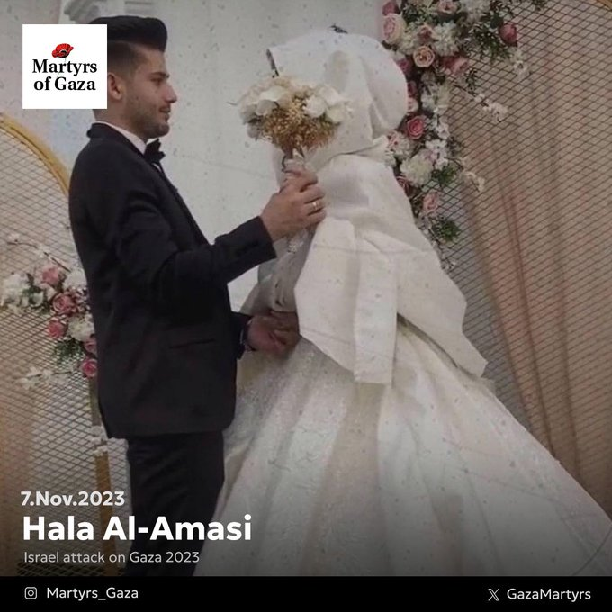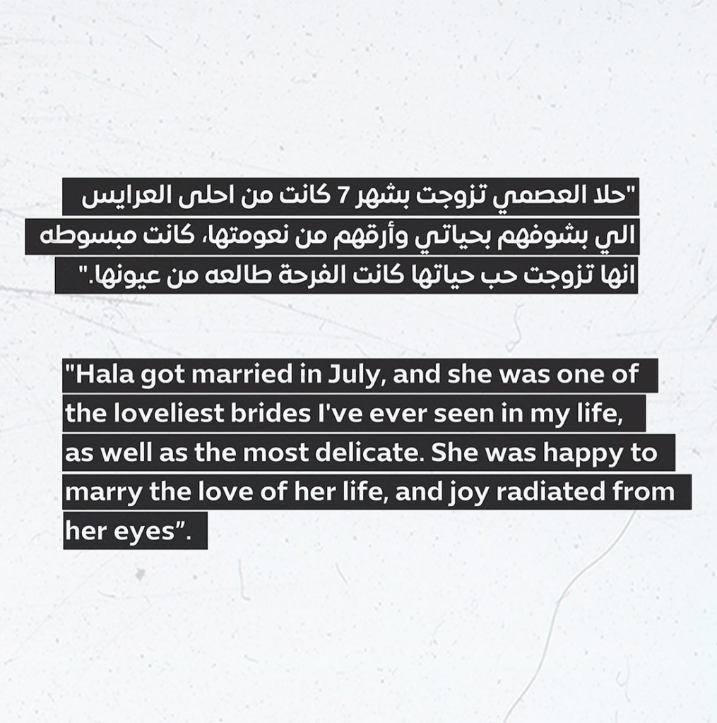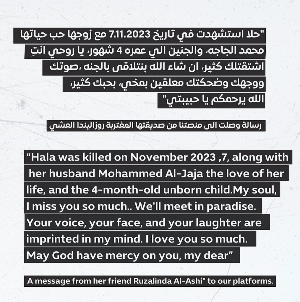 Muhammad Al-Jaja’s sister-in-law, Hala Al-Amsi, had married just that July and was four months pregnant, according to a message sent to the platform Untold Palestine by a friend of hers, Ruzalinda Al-Ashi. “I’m writing these words with tears in my eyes; they flow for my companion and the love of my heart, Hala.” In her message, she also mentioned that her friend was “happy to marry the love of her life” and that “joy radiated from her eyes”. “She is a very kind girl with a pure heart, a light on the soul, and a true friend.”