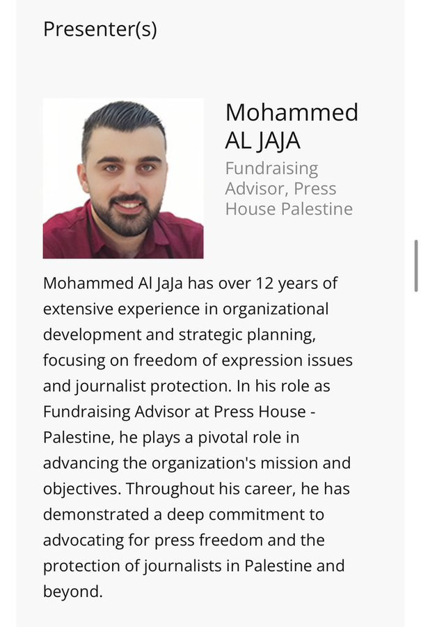 The day after he was killed, Muhammad Al-Jaja, along with Belal Jadallah, was scheduled to participate as a speaker in the conference ‘Freedom of Expression and Information: What Is the Role of New Media?’, organised by the Council of Europe within the World Forum for Democracy. In a biography published on the conference’s website, now dedicated to the memory of both journalists, it was stated that Muhammad had “12 years of extensive experience in organizational development and strategic planning, focusing on freedom of expression issues and journalist protection”. The biography also highlighted that he had “demonstrated a deep commitment to advocating for press freedom and the protection of journalists in Palestine and beyond.”