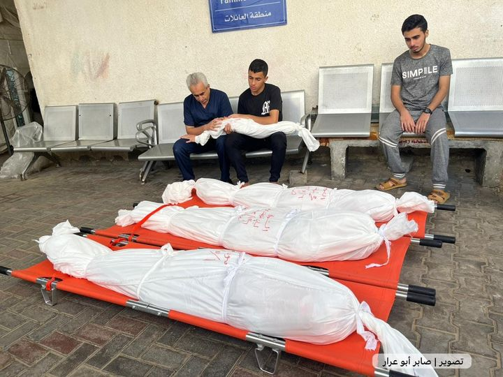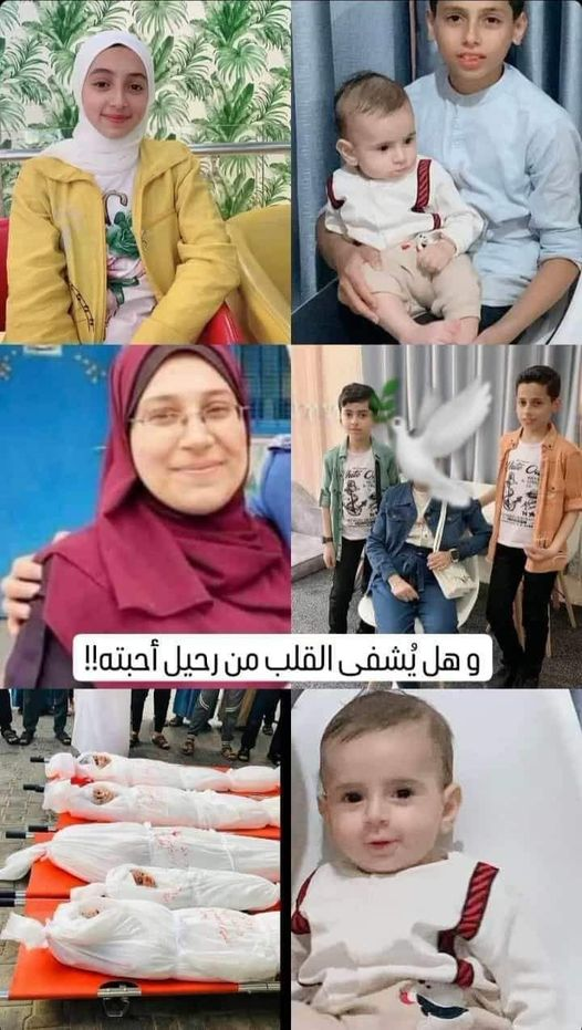 Mohammed Abdeljader Abu Alwan shared another post, in which he mourned the loss of his dear “second sister” Maysoun, and her children. “I tremble and cry and I cannot speak or write about you, my dear second sister/ Maysoun” he wrote. He attached a collage including several images of Lian Talat Barhoum, Abdul Rahman Talat Barhoum, Muhammad Talat Barhoum, Ahmed Talat Barhoum, and Maysoun Abdul Qader Barhoum, smiling at the camera. One of the pictures depicted them in white body bags, lying on orange stretchers.