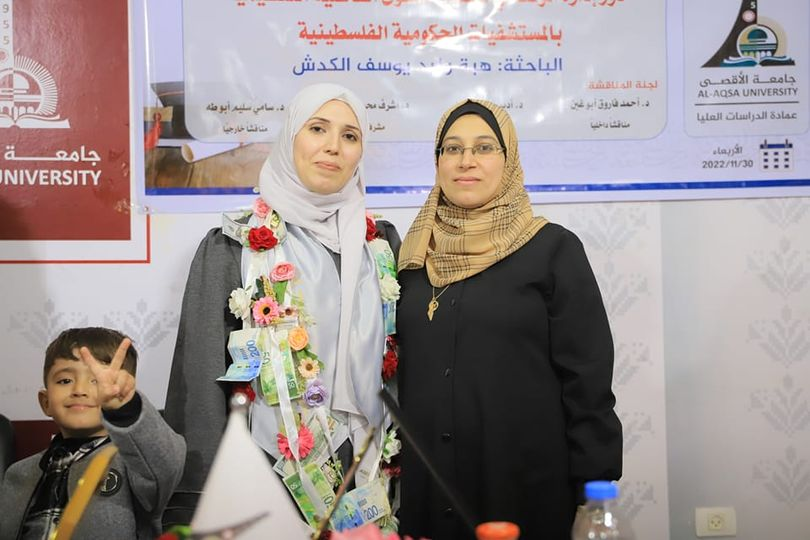 A Facebook post by Magdy Juma Barhoum described Maysoun Abdul Qader Barhoum as a “righteous mother, a virtuous sister, and a dutiful daughter.” Magdy shared her pride in the three children for memorizing the Book of Allah, and called the youngest Ahmed “the infant bird of paradise.” She called for God to give the remaining family patience and comfort and concluded with a picture of Talat Barhoum and two other men holding a small body bag, with three more body bags on orange stretchers on the floor. In another Facebook post, Heba W. Kab shares her condolences to the family, describing Maysoun Abdul Qader Barhoum as an honorable teacher. Attached to the post is a picture of her smiling with Maysoun and a small grinning child, at the Al-Aqsa University.