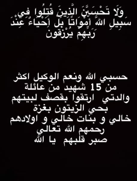 Other friends, Mahmoud Zourb Abo Mustafa, Alaa Abo Anas, Alaa Alaa, and Fares al-Jabri, also shared the same image of the corpses and offered condolences to Kamel al-Heqi for the death of his family members.