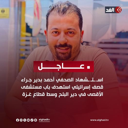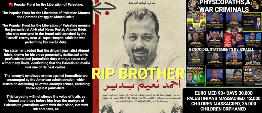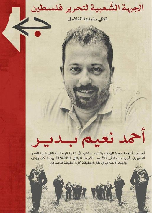 On Wednesday afternoon, January 10th, 2024, Palestinian journalist Ahmad (Ahmed) Bedir (Bdeir), also called Abu Naeem, was among at least ten civilians killed in an alleged Israeli airstrike on a house. Some reports put the death toll as high as 40. Another 30 civilians were reported injured, in the home near the western hospital gate of Al Aqsa Martyrs (Shuhada Al Aqsa) Hospital in Deir Al Balah in the Gaza Strip.