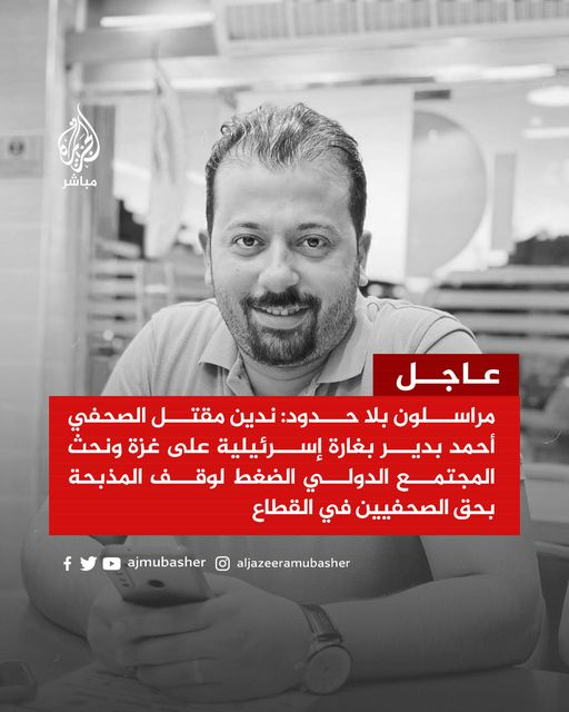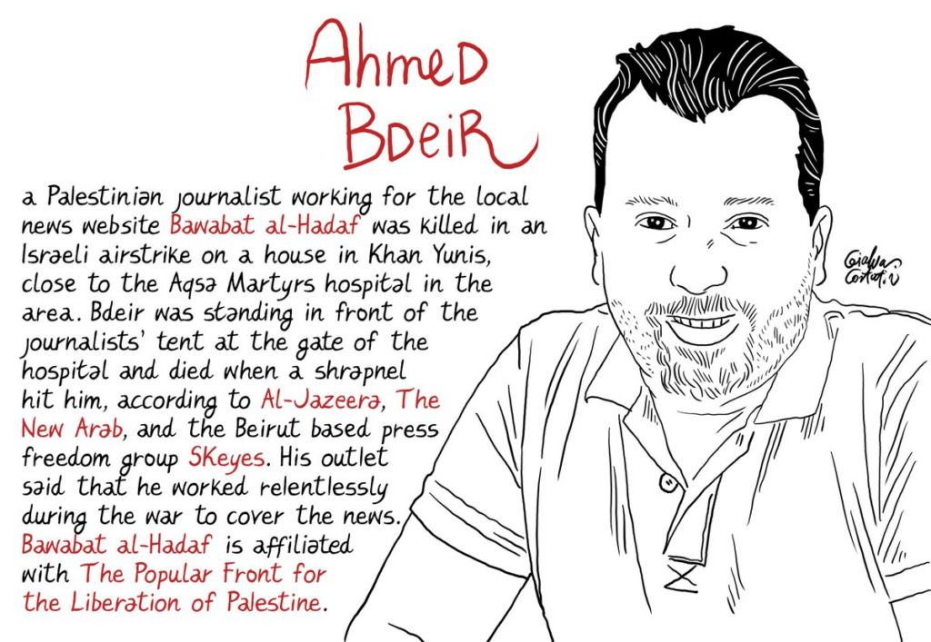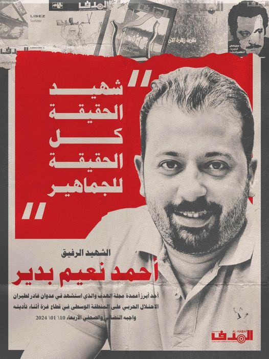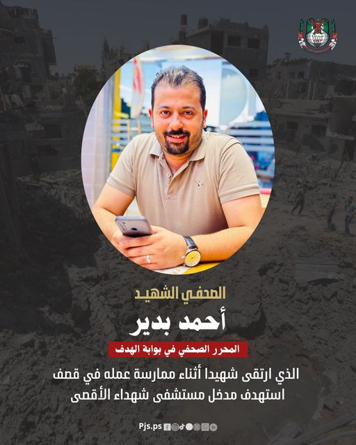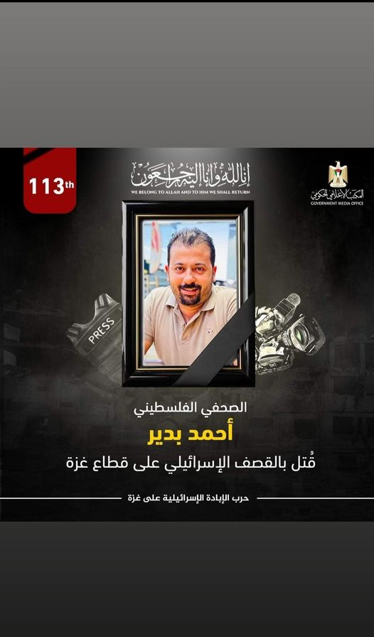 Ahmad Bedir was the 115th journalist to be killed in the Gaza Strip since the start of the conflict according to New Arab News referring to the Palestinian government’s media office. The political party the Popular Front for the Liberation of Palestine mourned the journalist’s death in its statement, having written that he was “known for his brave personality dedicated to his professional and journalistic duty without pause and without any limits”, and adding that the Palestinian media lost one of its best cadres.