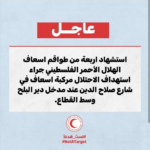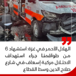 Shehab Agency reported that six civilians were killed as a result of the bombardment that hit the ambulance. Later, the agency tweeted the statement of the Palestinian Red Crescent condemning the killing of its four crew members. The PRCS also announced that two patients who were transported in the ambulance were injured and died of their injuries.