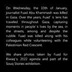 On Wednesday, January 10th 2024, volunteer journalist and photographer for the Palestinian Red Crescent Society (PRCS), 26-year-old Fouad Abu Khammash, was killed alongside three members of PRCS crew and two patients in an ambulance on Salah al-Din Street in Deir al-Balah in the central Gaza Strip, after a Palestinian Red Crescent ambulance was hit by an alleged Israeli drone strike as it was approaching Al-Aqsa Martyrs Hospital.
