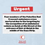 According to the Palestinian Red Crescent Society, these were the last words of the volunteer Fouad Abu Khammash before he died alongside his three colleagues during the alleged Israeli strike of the PRCS Ambulance while it was evacuating two wounded people in Deir al-Balah. PRCS dedicated a video to the late Fouad where he could be seen rescuing children and capturing the aftermath of deadly airstrikes, and his colleagues were grieving over his sudden death.